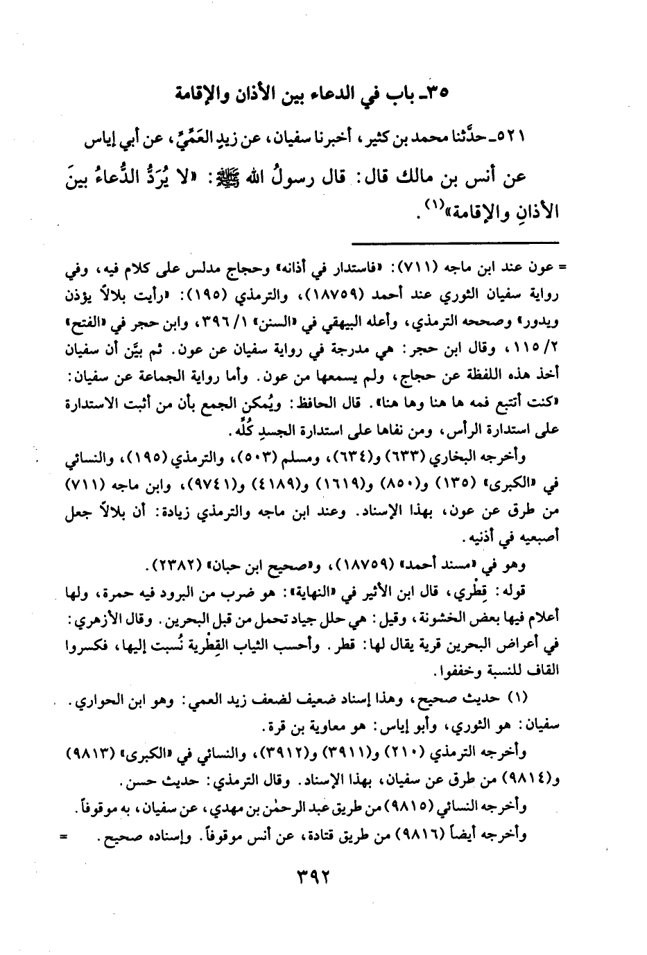 عن أنس بن مالك قال: قال رسولُ الله - صلى الله عليه وسلم -: "لا يُرَدُّ الدُّعاءُ بينَ الأذانِ والإقامة" (¬١).