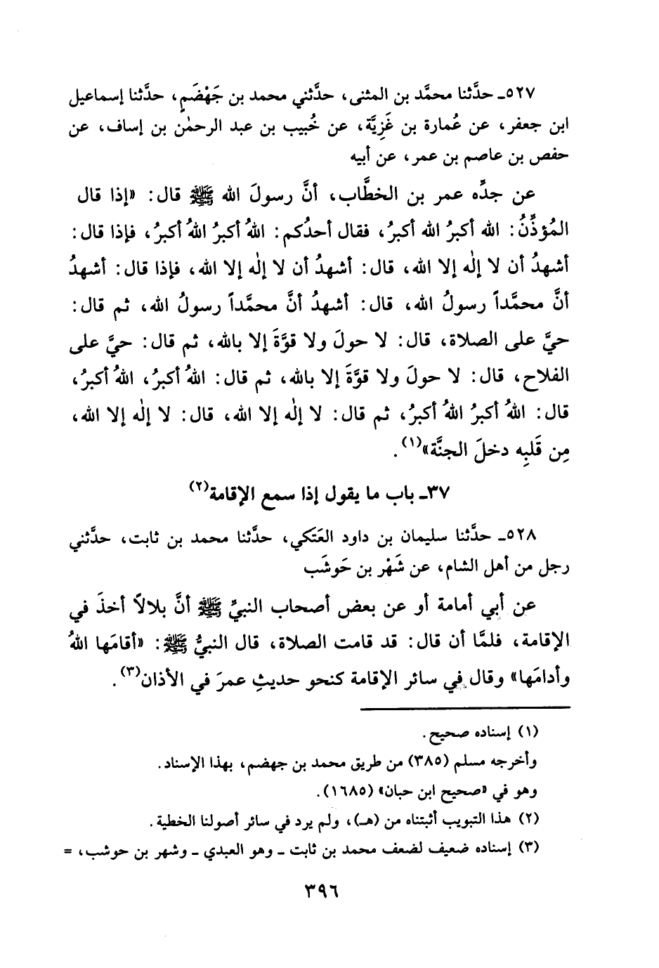 عن جدِّه عمر بن الخطَّاب, أنَّ رسولَ الله - صلى الله عليه وسلم - قال: "إذا قال المُؤذنُ: الله أكبرُ الله أكبرُ، فقال أحدُكم: اللهُ أكبرُ اللهُ أكبرُ، فإذا قال: أشهدُ أن لا إله إلا الله، قال: أشهدُ أن لا إله إلا الله، فإذا قال: أشهدُ أن محمَّداً رسولُ الله، قال: أشهدُ أن محمَّداً رسولُ الله، ثمَّ قال: حيَّ على الصلاة، قال: لا حولَ ولا قوَّةَ إلا بالله، ثمَّ قال: حيّ على الفلاح، قال: لا حولَ ولا قوَةَ إلا بالله، ثمَّ قال: اللهُ أكبرُ، اللهُ أكبرُ، قال: اللهُ أكبرُ اللهُ أكبرُ، ثمَّ قال: لا إله إلا الله، قال: لا إله إلا الله، مِن قَلبِه دخلَ الجنَة" (¬١).