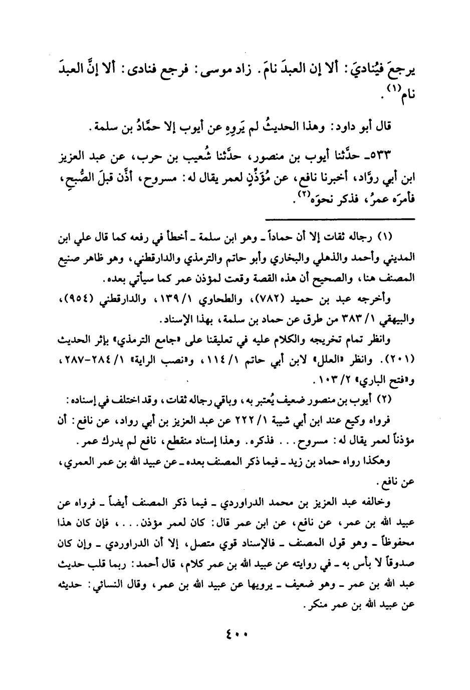 ٥٣٣ - حدَّثنا أيوب بن منصور، حدَّثنا شُعيب بن حرب، عن عبد العزيز ابن أبي روّاد، أخبرنا نافع، عن مُؤَذّنٍ لعمر يقال له: مسروح، أذّن قبلَ الصبحِ، فأمرَه عمرُ، فذكر نحوَه (¬٢).
