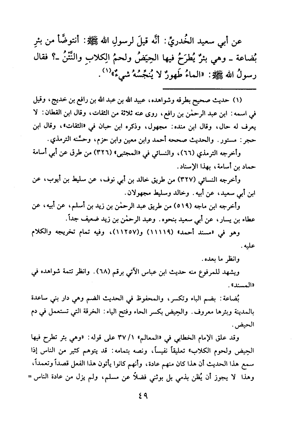 عن أبي سعيد الخُدريِّ: أنَّه قيلَ لرسولِ الله - صلى الله عليه وسلم -: أنتوضَّأ من بئرِ بُضاعة -وهي بئرٌ يُطرَحُ فيها الحِيَضُ ولحمُ الِكلابِ والنَّتْنُ-؟ فقال رسولُ الله - صلى الله عليه وسلم -: "الماءُ طَهورٌ لا يُنجِّسُهُ شيءٌ" (¬١).