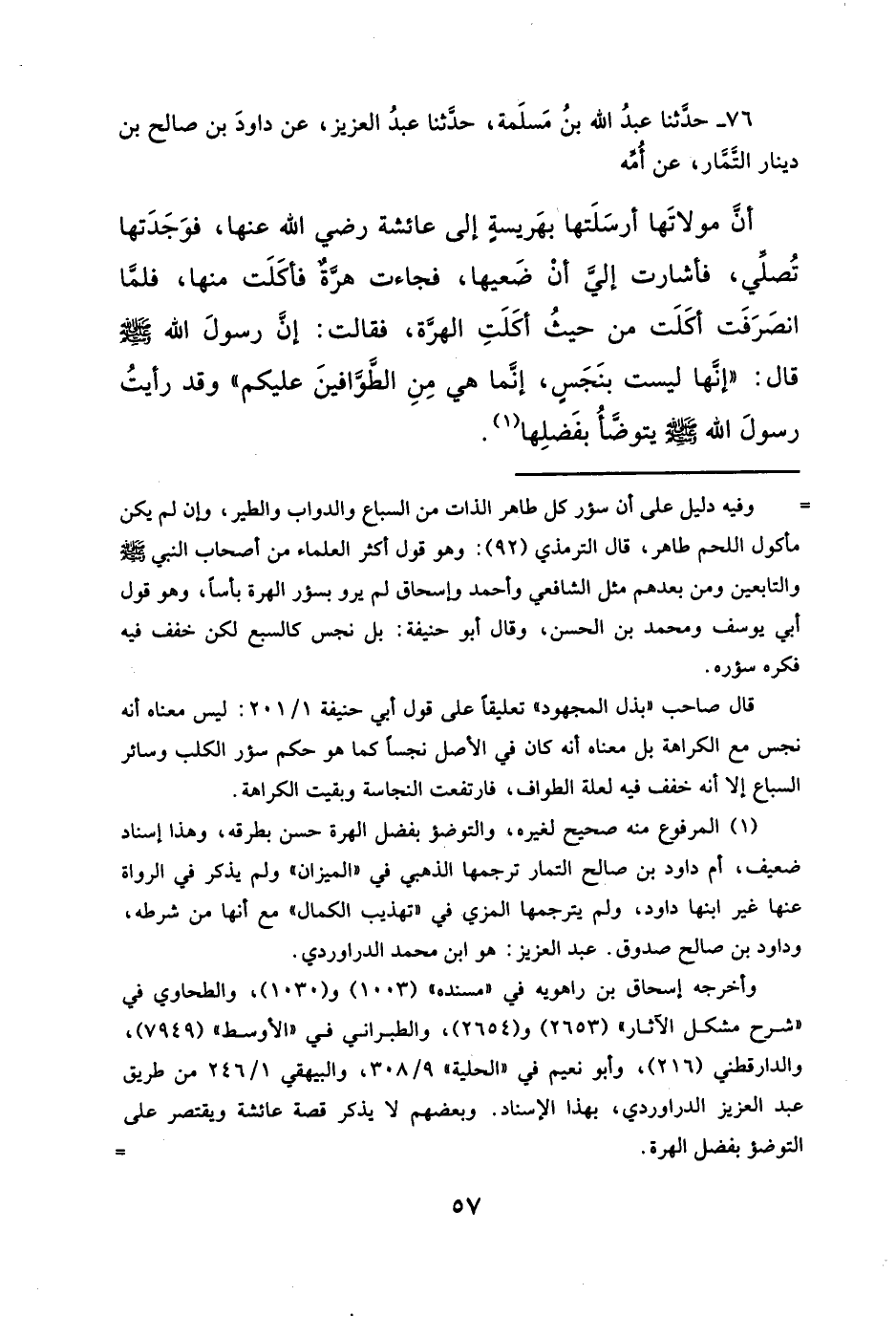 =وفيه دليل على أن سؤر كل طاهر الذات من السباع والدواب والطير، وإن لم يكن مأكول اللحم طاهر، قال الترمذي (٩٢): وهو قول أكثر العلماء من أصحاب النبي - صلى الله عليه وسلم - والتابعين ومن بعدهم مثل الشافعي وأحمد وإسحاق لم يرو بسؤر الهرة بأساً، وهو قول أبي يوسف ومحمد بن الحسن، وقال أبو حنيفة: بل نجس كالسبع لكن خفف فيه فكره سؤره.