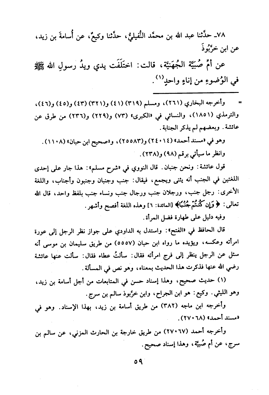 عن أمِّ صُبَيَّة الجُهَنيَّة، قالت: اختَلَفَت يدي ويدُ رسولِ الله - صلى الله عليه وسلم - في الوُضوءِ من إناءٍ واحدٍ (¬١).