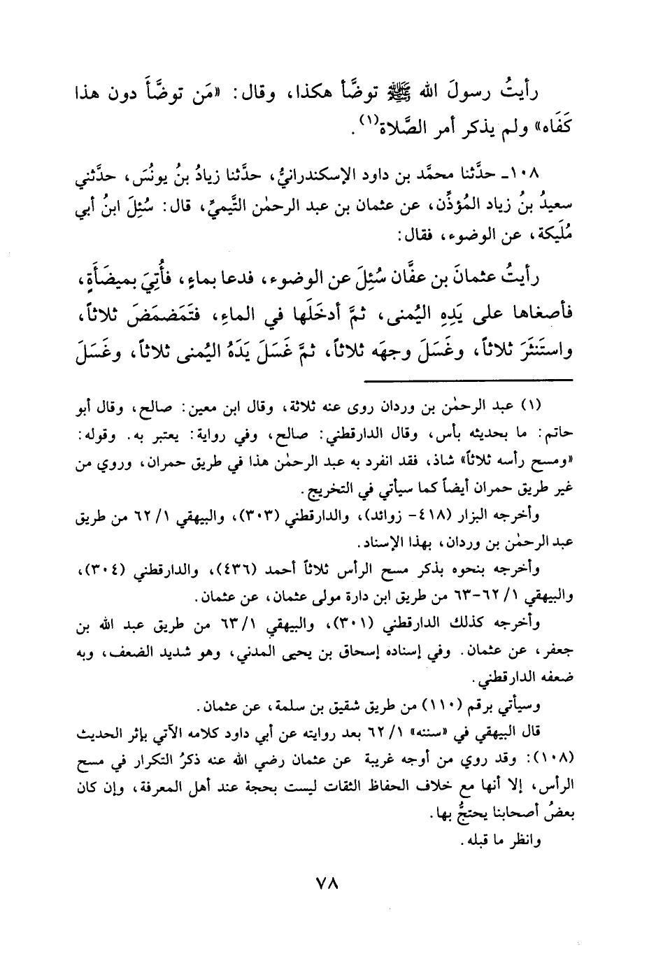 قال البيهقي في "سننه" ١/ ٦٢ بعد روايته عن أبي داود كلامه الآتي بإثر الحديث (١٠٨): وقد روي من أوجه غريبة عن عثمان رضي الله عنه ذكرُ التكرار في مسح الرأس، إلا أنها مع خلاف الحفاظ الثقات ليست بحجة عند أهل المعرفة، وإن كان بعضُ أصحابنا يحتجُّ بها.