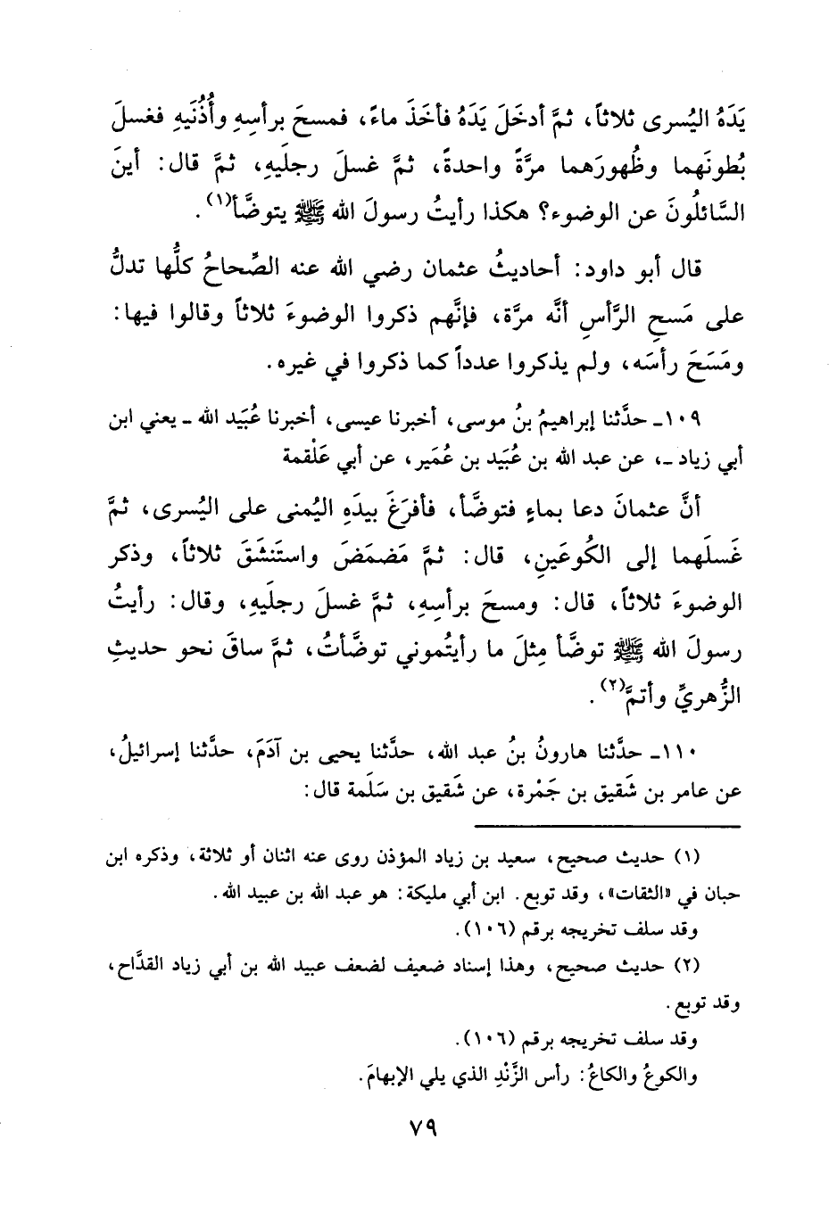 قال أبو داود: أحاديثُ عثمان رضي الله عنه الصِّحاحُ كلُّها تدلُّ على مَسحِ الرأسِ أنَّه مرَّة، فإنَّهم ذكروا الوضوءَ ثلاثاً وقالوا فيها: ومَسَحَ رأسَه، ولم يذكروا عدداً كما ذكروا في غيره.
