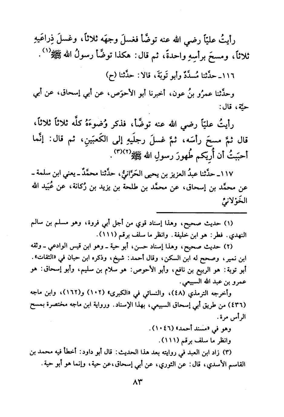 رأيتُ عليّاً رضي الله عنه توضَّأ فغسلَ وجهَه ثلاثاً، وغسلَ ذراعَيهِ ثلاثاً، ومسحَ برأسِهِ واحدةً، ثم قال: هكذا توضّأ رسولُ الله - صلى الله عليه وسلم - (¬١).