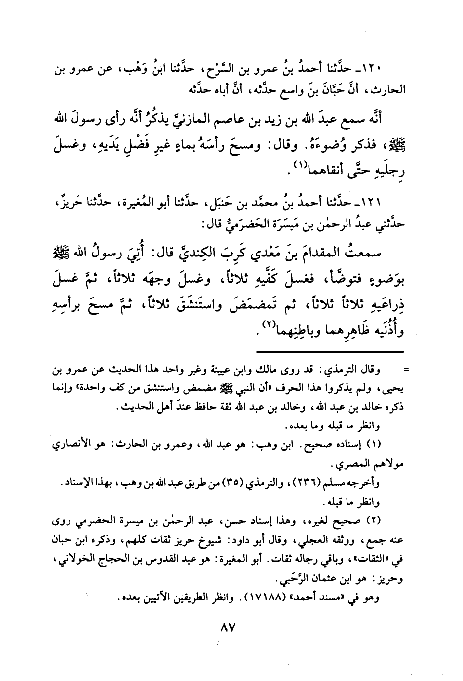 سمعتُ المقدامَ بنَ مَعْدي كَرِبَ الكِنديَّ قال: أُتِيَ رسولُ الله - صلى الله عليه وسلم - بوَضوءٍ فتوضَّأ، فغسلَ كَفيهِ ثلاثاً، وغسلَ وجهَه ثلاثاً، ثمَّ غسلَ ذِراعَيهِ ثلاثاً ثلاثاً، ثم تَمضمَضَ واستَنشَقَ ثلاثاً، ثمَّ مسحَ برأسِهِ وأُذُنَيه ظَاهِرِهما وباطِنِهما (¬٢).