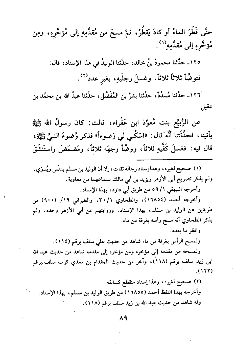 ولمسحه من مقدمه إلى مؤخره ومن مؤخره إلى مقدمه شاهد من حديث عبد الله ابن زيد سلف برقم (١١٨)، وآخر من حديث المقدام بن معدي كرب سلف برقم (١٢٢).