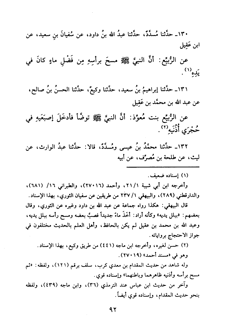 ١٣٠ - حدَّثنا مُسدَّدٌ، حدَّثنا عبدُ الله بنُ داود، عن سُفيانَ بنِ سعيد، عن ابن عَقِيل