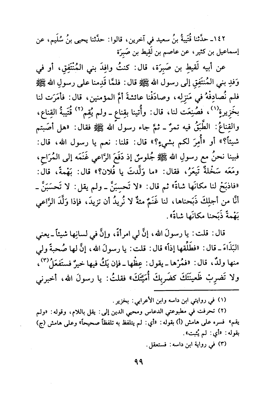 عن أبيه لَقيطِ بن صَبِرَة، قال: كنتُ وافِدَ بني المنْتَفِقِ، أو في وَفدِ بني المُنتَفِقِ إلى رسول الله - صلى الله عليه وسلم - قال: فلمَّا قَدِمنا على رسولِ الله - صلى الله عليه وسلم - فلم نُصادِفْهُ في مَنزِله، وصادَفْنا عائشةَ أمَ المؤمنين، قال: فأمَرَت لنا بخَزِيرةٍ (¬١)، فصُنِعَت لنا، قال: وأُتينا بقِناعٍ -ولم يُقِم (¬٢) قُتَيبةُ القِناع، والقِناعُ: الطَّبَقُ فيه تمرٌ- ثمَّ جاء رسول الله - صلى الله عليه وسلم - فقال: "هل أصَبتم شيئاً؟ "، أو "أُمِرَ لكم بشيءٍ؟ " قال: قلنا: نعم يا رسول الله، قال: فبينا نحنُ مع رسولِ الله - صلى الله عليه وسلم - جُلوسٌ إذ دفَعَ الرَّاعي غَنَمَه إلى المُرَاحِ، ومَعَه سَخْلةٌ تَيعَرُ، فقال: "ما وَلَّدتَ يا فُلان؟ " قال: بَهْمةً، قال: "فاذبَحْ لنا مكانَها شاةً" ثمَّ قال: "لا تَحسِبَنَّ -ولم يقل: لا تَحسَبَنَّ- أنَّا من أجلِكَ ذَبَحناها، لنا غَنَمٌ مئةٌ لا نُريدُ أن تزيدَ، فإذا وَلَّدَ الرَّاعي بَهْمةً ذَبَحنا مكانَها شاةً".