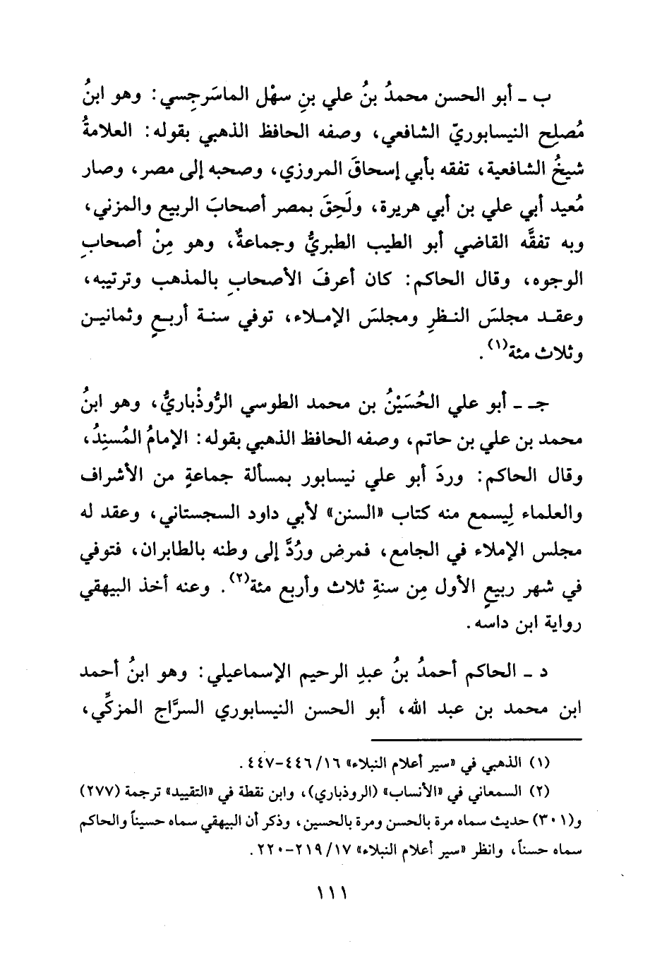 د- الحاكم أحمد بنُ عبدِ الرحيم الإسماعيلي: وهو ابنُ أحمد ابن محمد بن عبد الله، أبو الحسن النيسابوري السرَّاج المزكِّي،