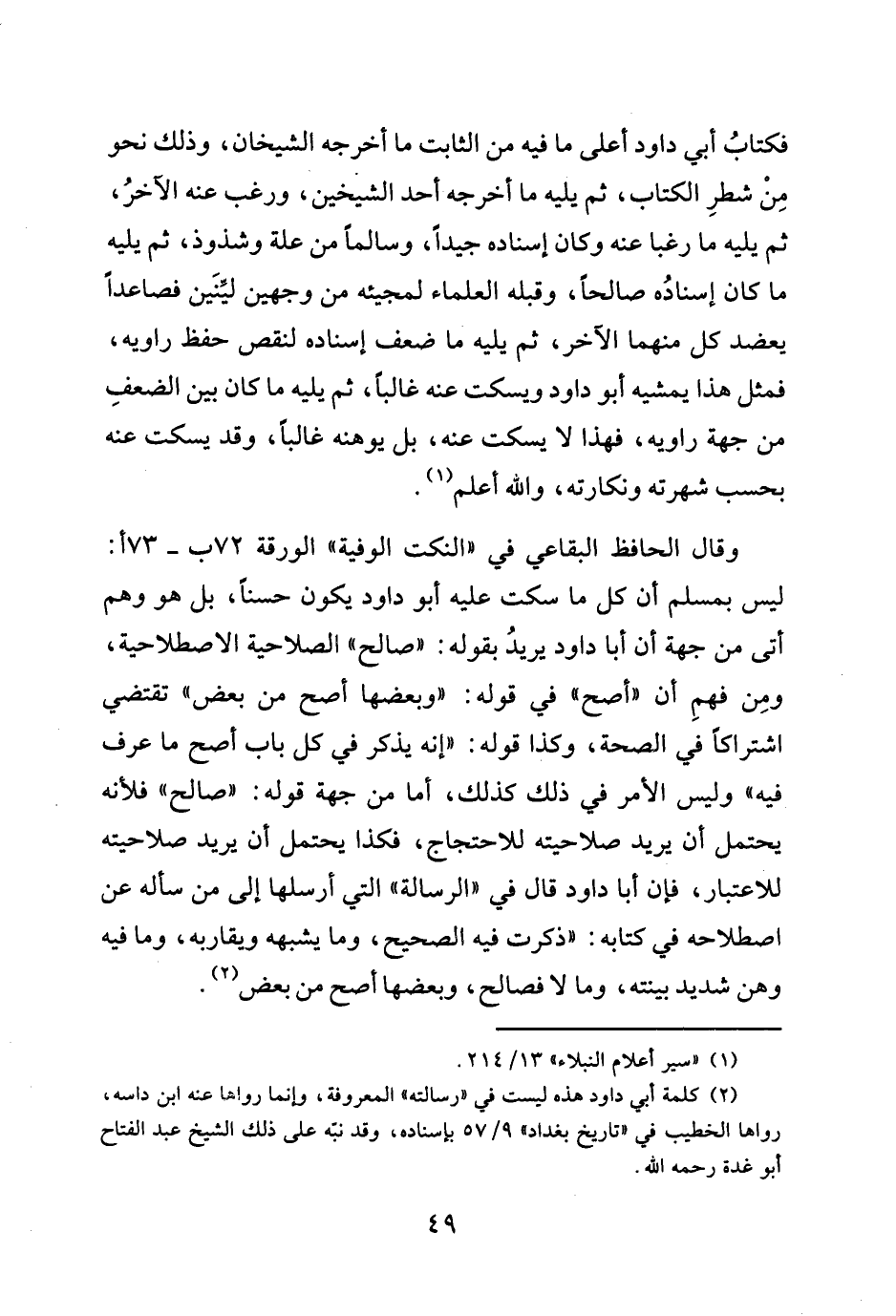 (¬٢) كلمة أبي داود هذه ليست في "رسالته" المعروفة، وإنما رواها عنه ابن داسه، رواها الخطيب في "تاريخ بغداد" ٩/ ٥٧ بإسناده، وقد نبّه على ذلك الشيخ عبد الفتاح أبو غدة رحمه الله.