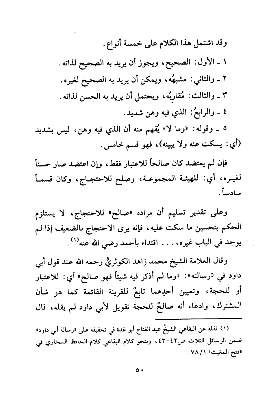 وقال العلامة الشيخ محمد زاهد الكوثريُّ رحمه الله عند قول أبي داود في "رسالته": "وما لم أذكر فيه شيئاً فهو صالح" أي: للاعتبار أو للحجة، وتعيين أحدِهما تابعٌ للقرينة القائمة كما هو شأن المشترك، وادعاء أنه صالح للحجة تقويل لأبي داود لم يقله، قال