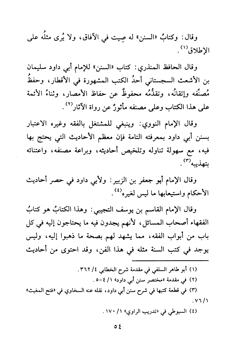 وقال الحافظ المنذري: كتاب "السنن" للإمام أبي داود سليمان بن الأشعث السجستاني أحدُ الكتب المشهورة في الأقطار، وحفظُ مُصنِّفه وإتقانُه، وتقدُّمُه محفوظٌ عن حفاظ الأمصار، وثناءُ الأئمة على هذا الكتاب وعلى مصنفه مأثور عن رواة الآثار (¬٢).