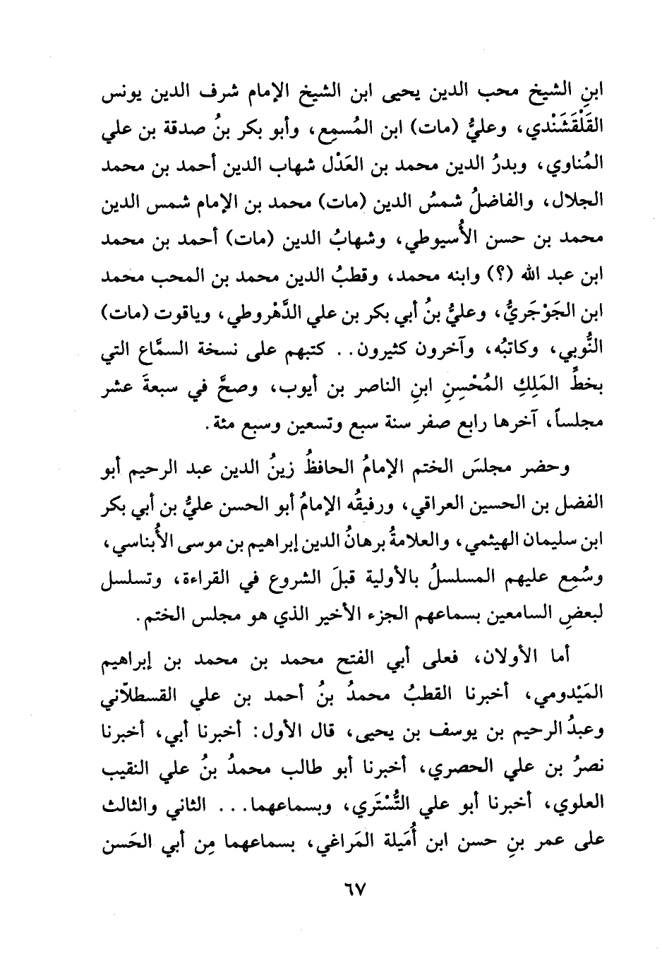 ابنِ الشيخ محب الدين يحيى ابن الشيخ الإمام شرف الدين يونس القَلقَشَندي، وعليُّ (مات) ابن المُسمع، وأبو بكر بنُ صدقة بن علي المُناوي، وبدرُ الدين محمد بن العَدْل شهاب الدين أحمد بن محمد الجلال، والفاضلُ شمسُ الدين (مات) محمد بن الإمام شمس الدين محمد بن حسن الأُسيوطي، وشهابُ الدين (مات) أحمد بن محمد ابن عبد الله (؟) وابنه محمد، وقطبُ الدين محمد بن المحب محمد ابن الجَوجَريُّ، وعليُّ بنُ أبي بكر بن علي الدَّهْروطي، وياقوت (مات) النُّوبي، وكاتبُه، وآخرون كثيرون .. كتبهم على نسخة السمَّاع التي بخطِّ المَلِكِ المُحسِنِ ابنِ الناصر بن أيوب، وصحَّ في سبعةَ عشر مجلساً، آخرها رابع صفر سنة سبع وتسعين وسبع مئة.