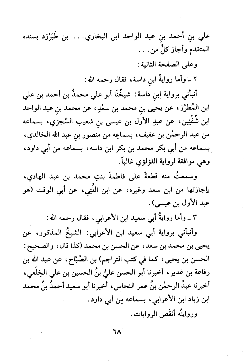 وأنبأني برواية أبي سعيد ابن الأعرابي: الشيخُ المذكور، عن يحيى بن محمد بن سعد، عن الحسن بن محمد (كذا قال، والصحيح: الحسن بن يحيى، كما في كتب التراجم) بن الصبَّاح، عن عبد الله بن رفاعة بن غدير، أخبرنا أبو الحسن عليُّ بنُ الحسين بن علي الخِلَعي، أخبرنا عبدُ الرحمن بنُ عمر النحاس، أخبرنا أبو سعيد أحمدُ بنُ محمد ابن زياد ابن الأعرابي، بسماعه مِن أبي داود.