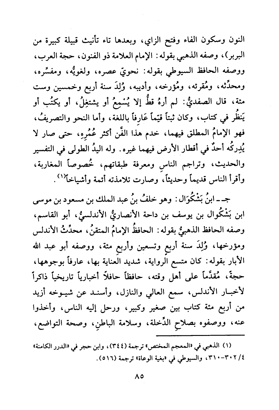 ج- ابنُ بَشكُوَال: وهو خلفُ بنُ عبد الملك بن مسعود بن موسى ابن بَشْكُوال بن يوسف بن داحة الأنصاريُّ الأندلسيُّ، أبو القاسم، وصفه الحافظ الذهبيُّ بقوله: الحافظُ الإمامُ المتقنُ، محدَّثُ الأندلس ومؤرخها، وُلِدَ سنة أربعٍ وتسعين وأربعِ مئة، ووصفه أبو عبد الله الأبار بقوله: كان متسع الرّواية، شديد العناية بها، عارفاً بوجوهها، حجةً، مُقدَّماً على أهل وقته، حافظاً حافلاً أخبارياً تاريخياً ذاكراً لأخبار الأندلس، سمع العالي والنازل، وأسند عن شيوخه أزيد من أربع مئة كتاب بين صغير وكبير، ورحل إليه الناس، وأخذوا عنه، ووصفوه بصلاحِ الدِّخلة، وسلامة الباطنِ، وصحة التواضع،