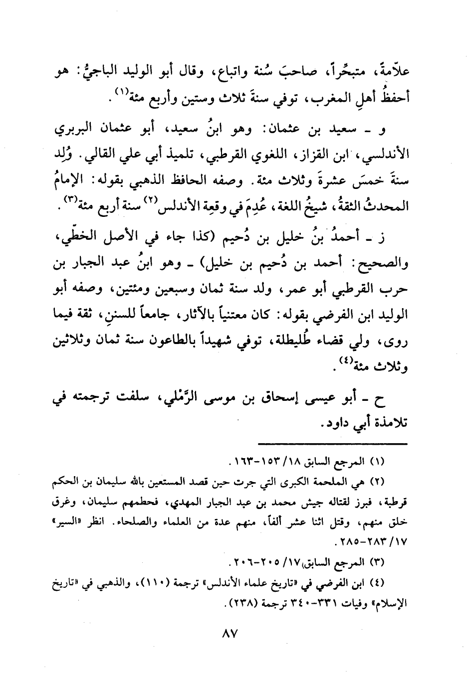 ز- أحمدُ بنُ خليل بن دُحيم (كذا جاء في الأصل الخطّي، والصحيح: أحمد بن دُحيم بن خليل) -وهو ابنُ عبد الجبار بن حرب القرطبي أبو عمر، ولد سنة ثمان وسبعين ومئتين، وصفه أبو الوليد ابن الفرضي بقوله: كان معتنياً بالآثار، جامعاً للسننِ، ثقة فيما روى، ولي قضاء طُليطلة، توفي شهيداً بالطاعون سنة ثمان وثلاثين وثلاث مئة (¬٤).