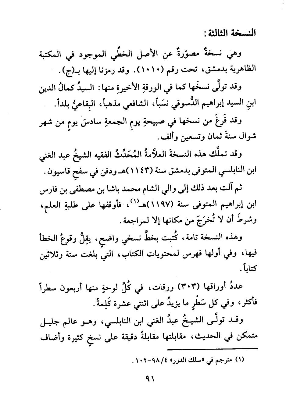 وقد تملَّك هذه النسخةَ العلَاّمةُ المُحَدثُ الفقيه الشيخُ عبد الغني ابن النابلسي المتوفى بدمشق سنة (١١٤٣) هـ ودفن في سفحِ قاسيون.