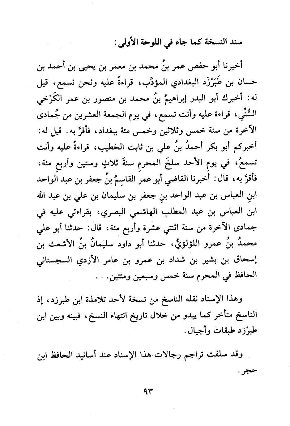أخبرنا أبو حفص عمر بنُ محمد بن معمر بن يحيى بن أحمد بن حسان بن طَبَرْزَد البغدادي المؤدِّب، قراءةً عليه ونحن نسمع، قيل له: أخبرك أبو البدر إبراهيمُ بنُ محمد بن منصور بن عمر الكَرْخي السُّنِّي، قراءة عليه وأنت تسمع، في يوم الجمعة العشرين من جُمادى الآخرة من سنة خمس وثلاثين وخمس مئة ببغداد، فأقرَّ به. قيل له: أخبركم أبو بكر أحمدُ بنُ علي بن ثابت الخطيب، قراءةً عليه وأنت تسمعُ، في يومِ الأحد سلخَ المحرمِ سنةَ ثلاثٍ وستين وأربعِ مئة، فأقرَّ به، قال: أخبرنا القاضي أبو عمر القاسِمُ بنُ جعفر بن عبد الواحد ابنِ العباس بن عبد الواحد بنِ جعفر بن سليمان بن علي بن عبد الله ابن العباس بن عبد المطلب الهاشمي البصري، بقراءتي عليه في جمادى الآخرة من سنة اثنتي عشرة وأربع مئة، قال: حدثنا أبو علي محمدُ بنُ عمرو اللؤلؤيُّ، حدثنا أبو داود سليمانُ بنُ الأشعث بن إسحاق بن بشير بن شداد بن عمرو بن عامر الأزدي السجستاني الحافظ في المحرم سنة خمس وسبعين ومئتين ...