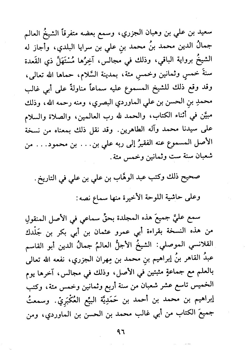 سعيد بن علي بن وهبان الجزري، وسمع بعضه متفرقاً الشيخُ العالم جمالُ الدين محمد بنُ محمد بنِ علي بن سرايا البلدي، وأجاز له الشيخُ برواية الباقي، وذلك في مجالس، آخِرُها مُسْتَهَلَّ ذي القعدة سنةَ خمسٍ وثمانين وخمسِ مئة، بمدينة السلام، حماها الله تعالى، وقد وقع ذلك للشيخ المسموع عليه سماعاً مناولةً على أبى غالب محمدِ بنِ الحسن بن علي الماوردي البصري، ومنه رحمه الله، وذلك مبيَّن في أثناء الكتاب، والحمد لله رب العالمين، والصلاة والسلام على سيدنا محمد وآله الطاهرين. وقد نقل ذلك بمعناه من نسخة الأصل المسموع عنه الفقيرُ إلى ربه علي بن ... بن محمود ... من شعبان سنة ست وثمانين وخمس مئة.