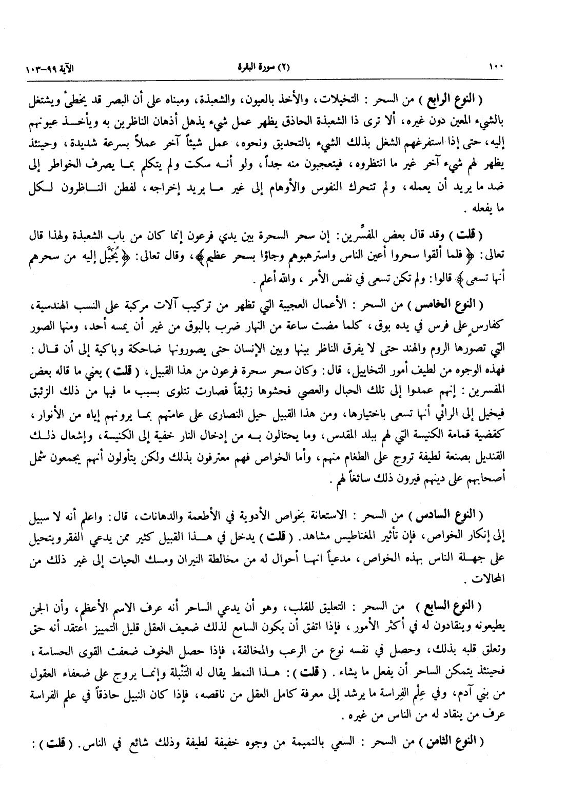 (النَّوْعُ الْخَامِسُ) مِنَ السِّحْرِ: الْأَعْمَالُ العجيبة التي تظهر من تركيب آلات مركبة على النِّسَبِ الْهَنْدَسِيَّةِ، كَفَارِسٍ عَلَى فَرَسٍ فِي يَدِهِ بُوقٌ، كُلَّمَا مَضَتْ سَاعَةً مِّنَ النَّهَارِ ضَرَبَ بِالْبُوقِ مِنْ غَيْرِ أَنْ يَمَسَّهُ أَحَدٌ، وَمِنْهَا الصُّوَرُ التِي تُصَوِّرُهَا الرُّومُ وَالْهِنْدُ حَتَّى لَا يفرق الناظر بينها وبين الإنسان حتى يصورنها ضاحكة؟؟ إِلَى أَنْ قَالَ: فَهَذِهِ الْوُجُوهُ مِنْ لَطِيفِ أمور التخاييل، قَالَ: وَكَانَ سِحْرُ سَحَرَةِ فِرْعَوْنَ مِنْ هَذَا القبيل،؟؟ مَا قَالَهُ بَعْضُ الْمُفَسِّرِينَ: أَنَّهُمْ عَمَدُوا إِلَى تِلْكَ الْحِبَالِ وَالْعِصِيِّ فَحَشَوْهَا زِئْبَقًا فَصَارَتْ تَتَلَوَّى بِسَبَبِ مَا فِيهَا مِنْ ذَلِكَ الزِّئْبَقِ فَيُخَيَّلُ إلى الرائي أنها تسعى باختيارها، وَمِنْ هَذَا الْقَبِيلِ حِيَلُ النَّصَارَى عَلَى عَامَّتِهِمْ بِمَا يُرُونَهُمْ إِيَّاهُ مِنَ الْأَنْوَارِ، كَقَضِيَّةِ قُمَامَةِ الْكَنِيسَةِ التِي لَهُمْ بِبَلَدِ الْمَقْدِسِ، وَمَا يَحْتَالُونَ بِهِ مِنْ إِدْخَالِ النَّارِ خِفْيَةً إِلَى الْكَنِيسَةِ، وَإِشْعَالِ ذَلِكَ الْقِنْدِيلِ بِصَنْعَةٍ لَطِيفَةٍ تَرُوجُ عَلَى الطعام منهم، وأما الخواص فهم معترفون بِذَلِكَ وَلَكِنْ يَتَأَوَّلُونَ أَنَّهُمْ يَجْمَعُونَ شَمْلَ أَصْحَابِهِمْ على دينهم فيرون ذلك سائغاً لهم.