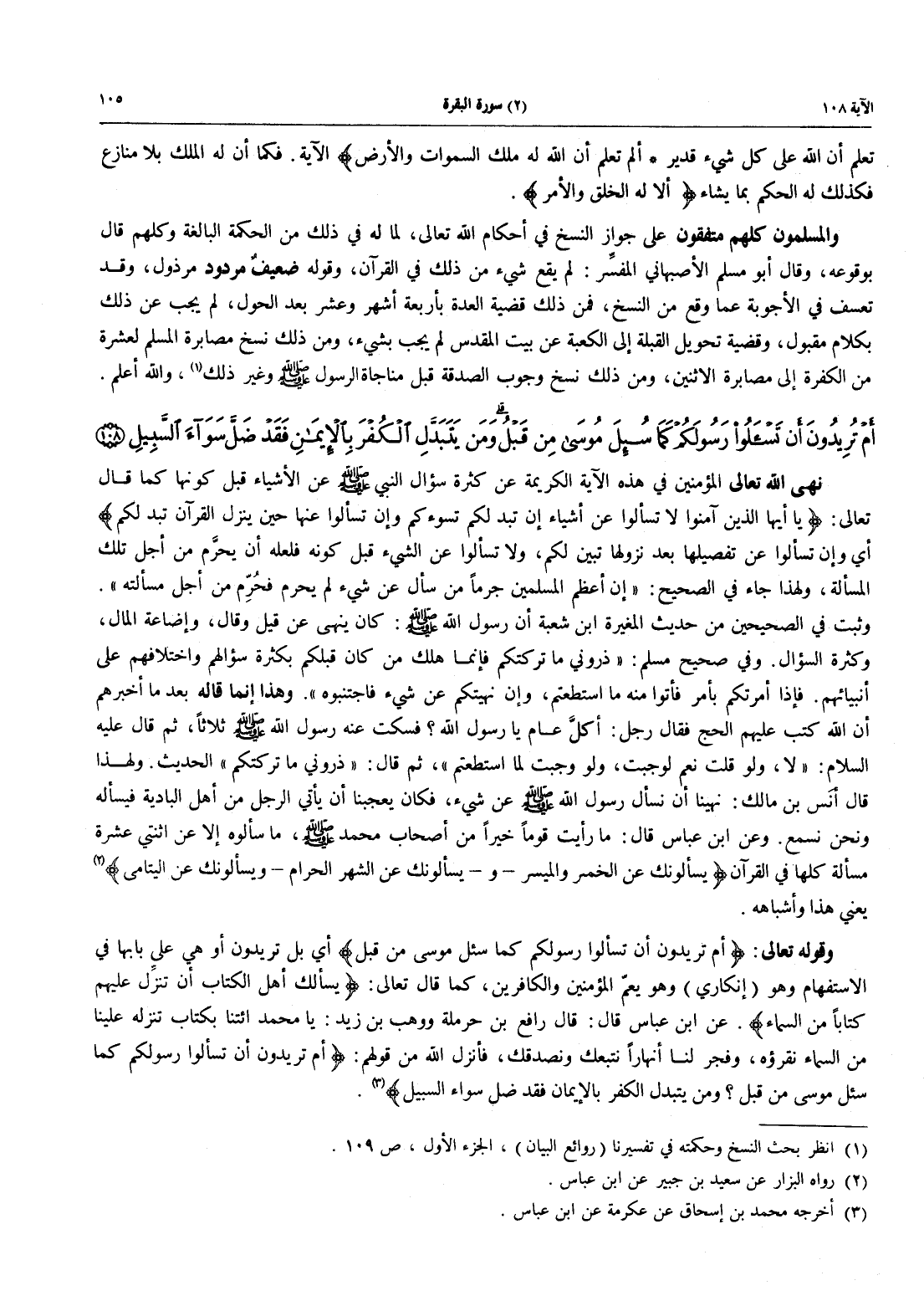 - 108 - أَمْ تُرِيدُونَ أَن تَسْأَلُواْ رَسُولَكُمْ كَمَا سُئِلَ مُوسَى مِن قَبْلُ وَمَن يَتَبَدَّلِ الْكُفْرَ بِالْإِيمَانِ فَقَدْ ضَلَّ سَوَآءَ السَّبِيلِ