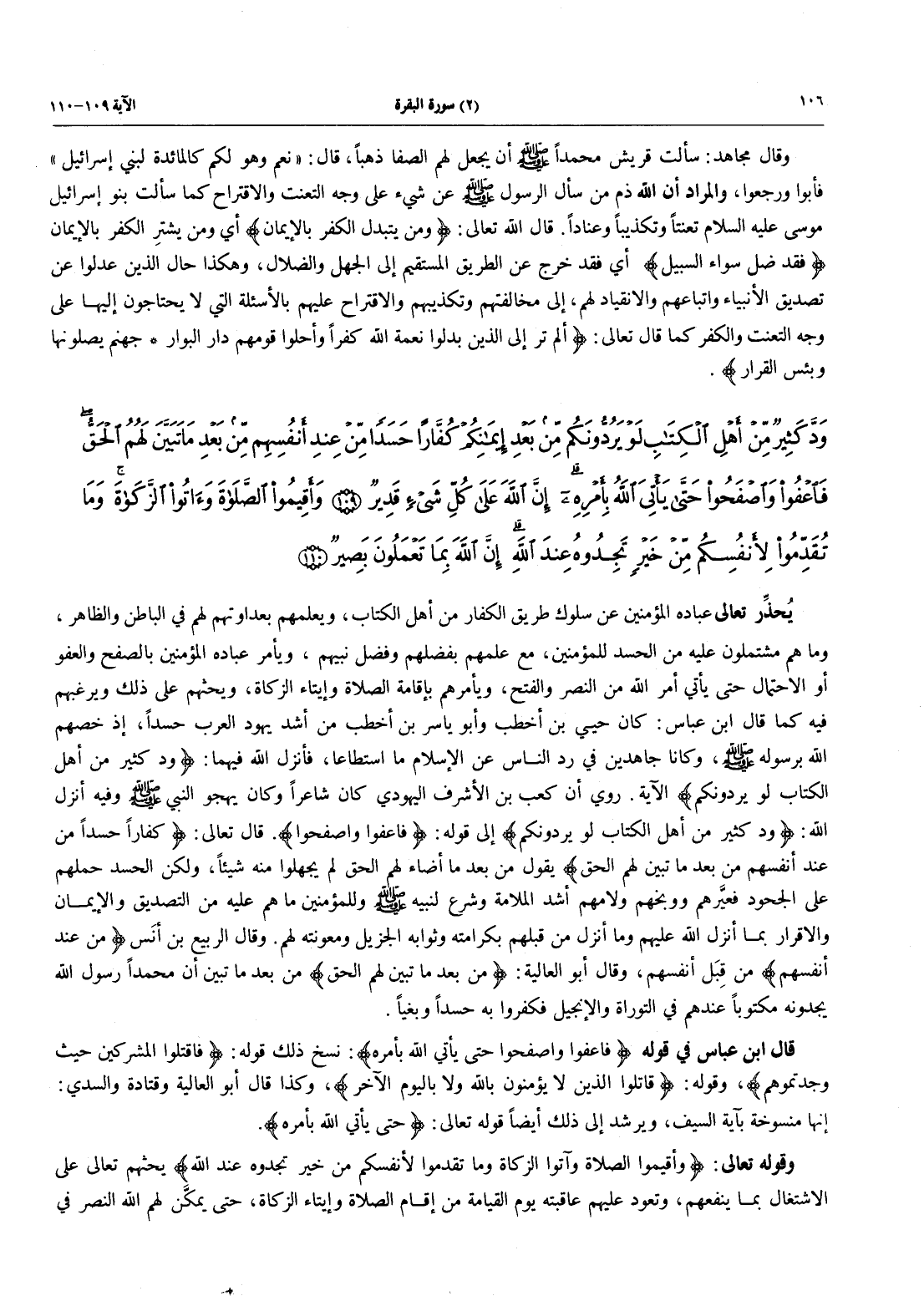 - 109 - وَدَّ كَثِيرٌ مِّنْ أَهْلِ الْكِتَابِ لَوْ يَرُدُّونَكُم مِنْ بَعْدِ إِيمَانِكُمْ كُفَّاراً حَسَداً مِّنْ عِنْدِ أَنْفُسِهِمْ مِنْ بَعْدِ مَا تَبَيَّنَ لَهُمُ الْحَقُّ فَاعْفُوا وَاصْفَحُوا حَتَّى يَأْتِيَ اللَّهُ بِأَمْرِهِ إِنَّ اللَّهَ عَلَى كُلِّ شَيْءٍ قَدِيرٌ