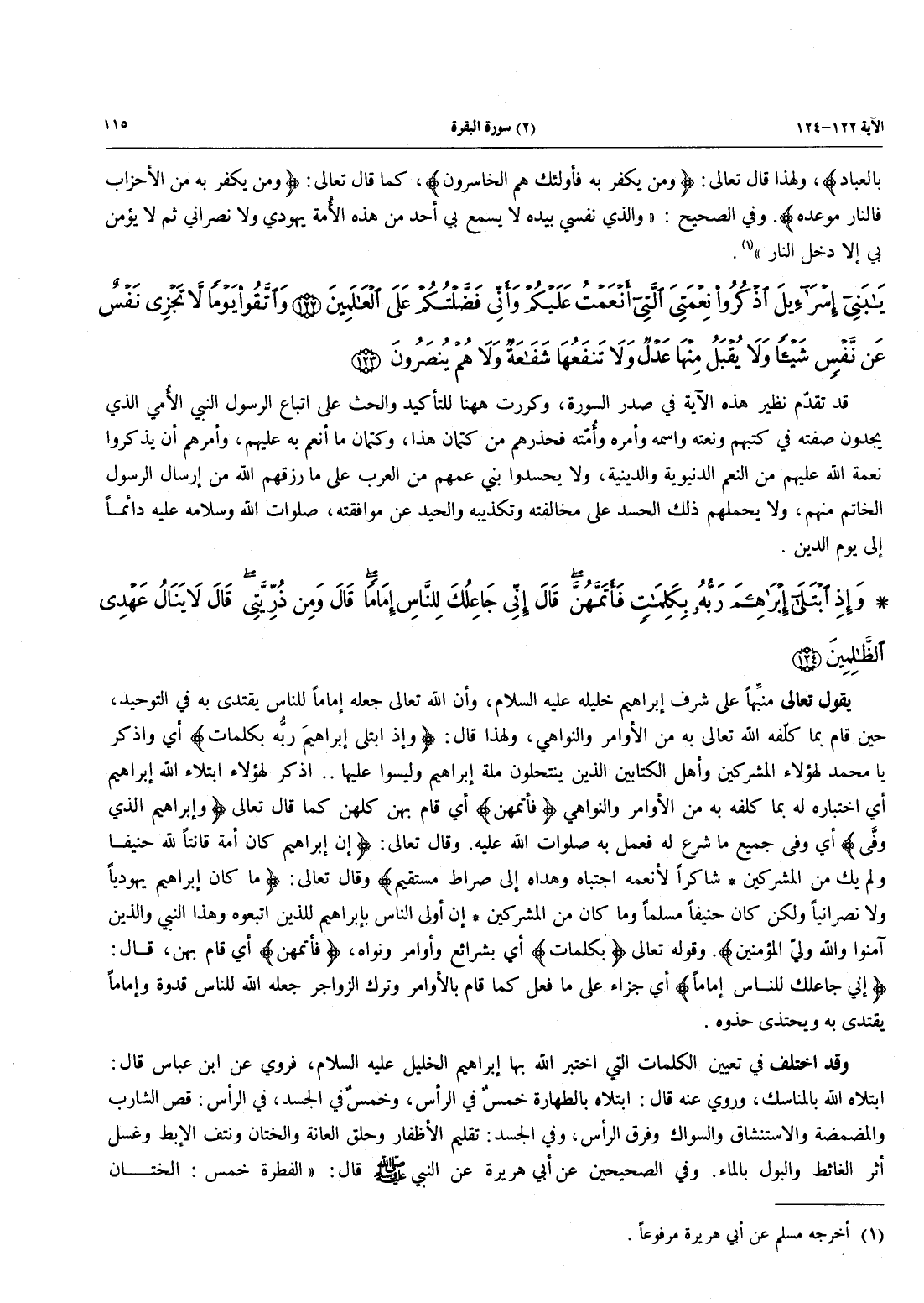 يَقُولُ تَعَالَى منبِّهاً عَلَى شَرَفِ إِبْرَاهِيمَ خَلِيلِهِ عَلَيْهِ السَّلَامُ، وَأَنَّ اللَّهَ تَعَالَى جَعَلَهُ إِمَامًا لِلنَّاسِ يُقْتَدَى به في التوحيد، حين قام به كَلَّفَهُ اللَّهُ تَعَالَى بِهِ مِنَ الْأَوَامِرِ وَالنَّوَاهِي، ولهذا قال: {وَإِذَا ابْتَلَى إِبْرَاهِيمَ رَبُّهُ بِكَلِمَاتٍ} أَيْ وَاذْكُرْ يَا محمد لهؤلاء المشركين وأهل الكتابين الذي ينتحلون ملة إبراهيم وليسوا عليها .. اذكر لهؤلاء ابتلاء الله إبراهيم أي اختاره لهم بِمَا كَلَّفَهُ بِهِ مِنَ الْأَوَامِرِ وَالنَّوَاهِي {فَأَتَمَّهُنَّ} أي قام بهن كلهن كما قالت تعالى {وَإِبْرَاهِيمَ الذي وفَّى} أَيْ وفَّى جَمِيعَ مَا شَرَعَ لَهُ فَعَمِلَ بِهِ صَلَوَاتُ اللَّهِ عَلَيْهِ. وَقَالَ تَعَالَى: {إِنَّ إِبْرَاهِيمَ كَانَ أُمَّةً قَانِتاً لِلَّهِ حَنِيفاً وَلَمْ يَكُ مِنَ الْمُشْرِكِينَ* شَاكِراً لأَنْعُمِهِ اجْتَبَاهُ وَهَدَاهُ إلى صِرَاطٍ مستقيم} وَقَالَ تَعَالَى: {مَا كَانَ إِبْرَاهِيمُ يَهُودِيّاً وَلاَ نَصْرَانِيّاً وَلَكِن كَانَ حَنِيفاً مُّسْلِماً وَمَا كَانَ من المشركين * إِنَّ أَوْلَى النَّاسِ بِإِبْرَاهِيمَ لَلَّذِينَ اتَّبَعُوهُ وَهَذَا النَّبِيُّ وَالَّذِينَ آمَنُواْ وَاللَّهُ وَلِيُّ المؤمنين}. وَقَوْلُهُ تَعَالَى {بِكَلِمَاتٍ} أَيْ بِشَرَائِعَ وَأَوَامِرَ وَنَوَاهٍ، {فَأَتَمَّهُنَّ} أَيْ قَامَ بِهِنَّ، قَالَ: {إِنِّي جَاعِلُكَ لِلنَّاسِ إِمَاماً} أَيْ جَزَاءً عَلَى مَا فَعَلَ كَمَا قَامَ بِالْأَوَامِرِ وَتَرَكَ الزَّوَاجِرَ جَعَلَهُ اللَّهُ لِلنَّاسِ قُدْوَةً وَإِمَامًا يُقْتَدَى بِهِ وَيُحْتَذَى حَذْوَهُ.