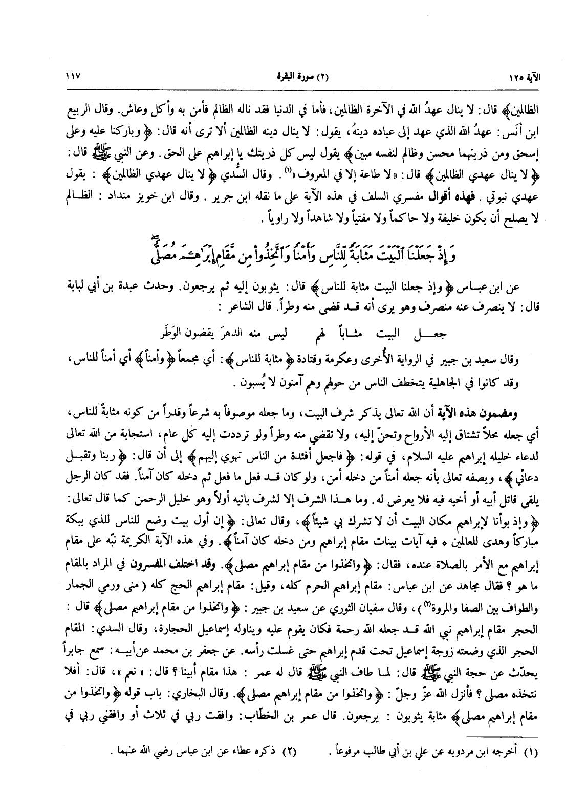 وَقَالَ سَعِيدُ بْنُ جُبَيْرٍ فِي الرواية الأخرى وعكرمة وقتادة {مَثَابَةً لِّلنَّاسِ}: أي مجمعاً {أمناً} أي أمناً للناس، وَقَدْ كَانُوا فِي الْجَاهِلِيَّةِ يُتَخَطَّفُ النَّاسُ مِنْ حَوْلِهِمْ وهم آمنون لا يُسبون.