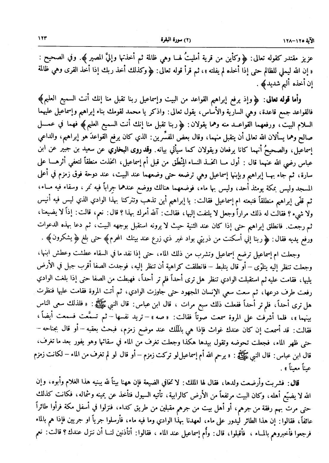 وأما قوله تعالى: {وإذا يَرْفَعُ إِبْرَاهِيمُ الْقَوَاعِدَ مِنَ الْبَيْتِ وَإِسْمَاعِيلُ رَبَّنَا تَقَبَّلْ مِنَّآ إِنَّكَ أَنتَ السميع العليم} فَالْقَوَاعِدُ جَمْعُ قَاعِدَةٍ، وَهِيَ السَّارِيَةُ وَالْأَسَاسُ، يَقُولُ تَعَالَى: وَاذْكُرْ يَا مُحَمَّدُ لِقَوْمِكَ بِنَاءَ إِبْرَاهِيمَ وَإِسْمَاعِيلَ عَلَيْهِمَا السَّلَامُ الْبَيْتَ، وَرَفْعَهُمَا الْقَوَاعِدَ مِنْهُ وَهُمَا يَقُولَانِ: {رَبَّنَا تَقَبَّلْ مِنَّآ إِنَّكَ أَنتَ السَّمِيعُ الْعَلِيمُ} فَهُمَا فِي عَمَلٍ صَالِحٍ وَهُمَا يسألان الله تعالى أن يتقبل منهما، وَقَالَ بَعْضُ المفسِّرين: الذِي كَانَ يَرْفَعُ القواعدَ هُوَ إِبْرَاهِيمُ، وَالدَّاعِي إِسْمَاعِيلُ، والصحيحُ أَنَّهُمَا كَانَا يَرْفَعَانِ وَيَقُولَانِ كَمَا سَيَأْتِي بَيَانُهُ. وَقَدْ رَوَى البخاري عَنْ سَعِيدِ بْنِ جُبَيْرٍ عَنِ ابْنِ عَبَّاسٍ رَضِيَ اللَّهُ عَنْهُمَا قَالَ: أَوَّلُ مَا اتَّخَذَ النساء المِنطَق من قبل أم إسماعيل، اتخذت منطقاً لتعفي أَثَرَهَا عَلَى سَارَّةَ، ثُمَّ جَاءَ بِهَا إِبْرَاهِيمُ وبإبنها إسماعيل وَهِيَ تُرْضِعُهُ حَتَّى وَضَعَهُمَا عِنْدَ الْبَيْتِ، عِنْدَ دَوْحَةٍ فَوْقَ زَمْزَمَ فِي أَعْلَى الْمَسْجِدِ وَلَيْسَ بِمَكَّةَ يومئذٍ أَحَدٌ، وَلَيْسَ بِهَا مَاءٌ، فَوَضَعَهُمَا هنالك ووضع عندها جِراباً فِيهِ تَمْرٌ، وَسِقَاءً فِيهِ مَاءٌ، ثُمَّ قفّى إبراهيم مُنْطَلِقًا فَتَبِعَتْهُ أُمُّ إِسْمَاعِيلَ فَقَالَتْ: يَا إِبْرَاهِيمُ أَيْنَ تَذْهَبُ وَتَتْرُكُنَا بِهَذَا الْوَادِي الذِي لَيْسَ فيه أنيس وَلَا شَيْءَ؟ فَقَالَتْ لَهُ ذَلِكَ مِرَارًا وَجَعَلَ لَا يَلْتَفِتُ إِلَيْهَا، فَقَالَتْ: آللَّهُ أَمَرَكَ بِهَذَا؟ قَالَ: نَعَمْ، قَالَتْ: إِذًا لَا يُضَيِّعُنَا، ثُمَّ رجعت فانطلق إبراهيم حَتَّى إِذَا كَانَ عِنْدَ الثَّنِيَّةِ حَيْثُ لَا يرونه استقبل بوجهه البيت، ثم دعا بهذه الدعوات ورفع يديه فَقَالَ: {رَّبَّنَآ إِنِّي أَسْكَنتُ مِن ذُرِّيَّتِي بِوَادٍ غَيْرِ ذِي زَرْعٍ عِندَ بَيْتِكَ المحرم} حتى بلغ {يَشْكُرُونَ}.