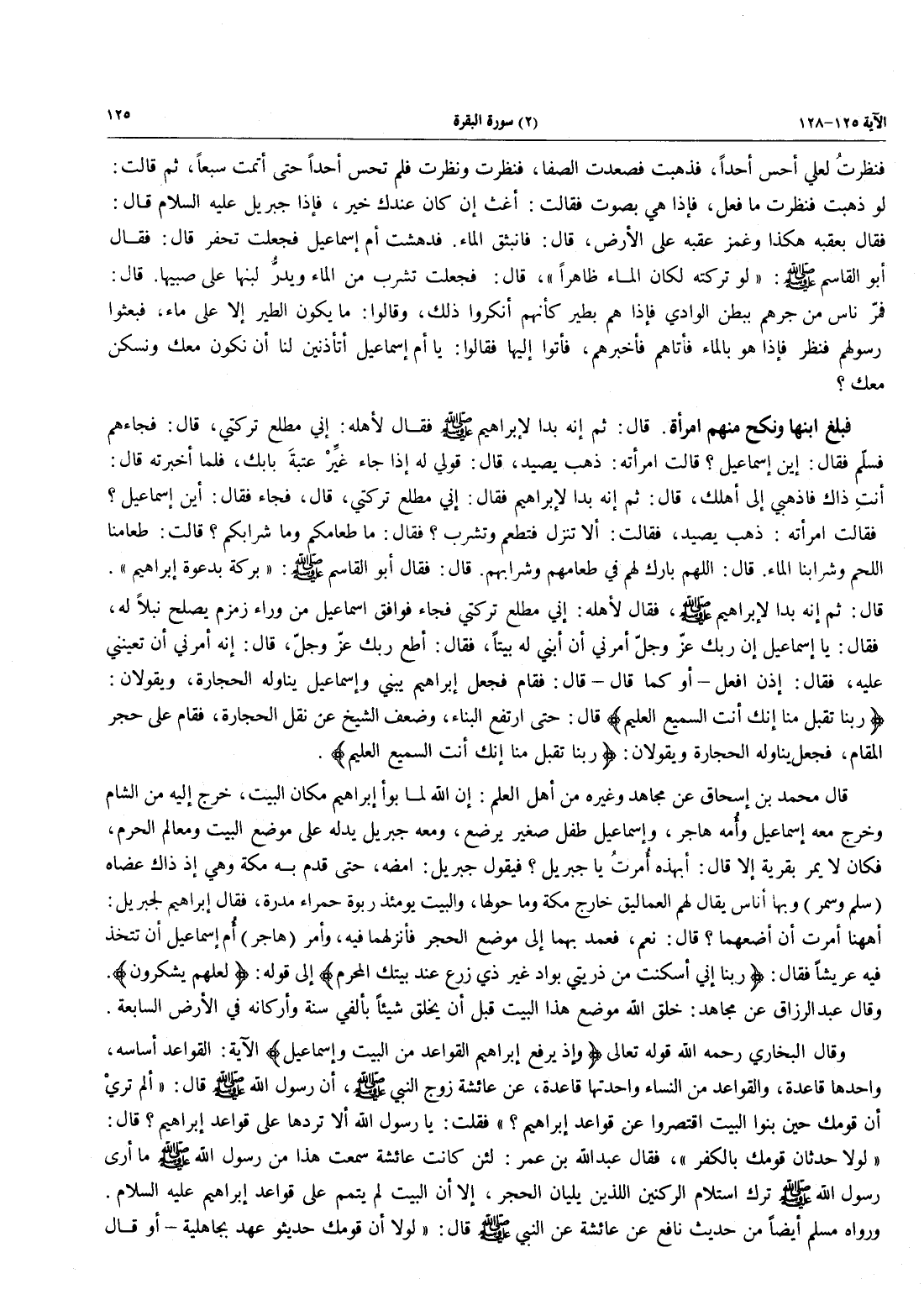 فَبَلَغَ ابْنُهَا ونكح منهم امْرَأَةً. قَالَ: ثُمَّ إِنَّهُ بَدَا لِإِبْرَاهِيمَ صَلَّى اللَّهُ عَلَيْهِ وَسَلَّمَ فَقَالَ لأَهْلِهِ: إِنِّي مُطَّلِعٌ تركتي، قال: فجاءهم فَسَلَّمَ فَقَالَ: أَيْنَ إِسْمَاعِيلُ؟ قَالَتِ امْرَأَتُهُ: ذَهَبَ يَصِيدُ، قَالَ: قُولِي لَهُ إِذَا جَاءَ غيَّرْ عتبةَ بابك، فلما أَخْبَرَتْهُ قَالَ: أنتِ ذَاكِ فَاذْهَبِي إِلَى أَهْلِكِ، قال: ثم إنه بدا لإبراهيم فقال: إِنِّي مُطَّلِعٌ تَرِكَتِي قَالَ، فَجَاءَ فَقَالَ: أَيْنَ إِسْمَاعِيلُ؟ فَقَالَتِ امْرَأَتُهُ: ذَهَبَ يَصِيدُ، فَقَالَتْ: أَلَا تَنْزِلَ فَتَطْعَمَ وَتَشْرَبَ؟ فَقَالَ: مَا طَعَامُكُمْ وَمَا شَرَابُكُمْ؟ قَالَتْ: طَعَامُنَا اللَّحْمُ وَشَرَابُنَا الْمَاءُ. قَالَ: اللَّهُمَّ بَارِكْ لَهُمْ فِي طَعَامِهِمْ وَشَرَابِهِمْ. قَالَ: فَقَالَ أَبُو الْقَاسِمِ صَلَّى اللَّهُ عَلَيْهِ وَسَلَّمَ: «بَرَكَةٌ بِدَعْوَةِ إِبْرَاهِيمَ». قَالَ: ثُمَّ إِنَّهُ بَدَا لِإِبْرَاهِيمَ صَلَّى اللَّهُ عَلَيْهِ وَسَلَّمَ، فَقَالَ لأَهْلِهِ: إني مطلع تركتي فجأة فوفق إِسْمَاعِيلَ مِنْ وَرَاءِ زَمْزَمَ يُصْلِحُ نَبْلًا لَهُ، فَقَالَ: يَا إِسْمَاعِيلُ إِنَّ رَبَّكَ عزَّ وجلَّ أَمَرَنِي أَنْ أَبْنِيَ لَهُ بَيْتًا، فَقَالَ: أَطِعْ ربك عزَّ وجلَّ، قال: إنه أَمَرَنِي أَنْ تُعِينَنِي عَلَيْهِ، فَقَالَ: إِذَنْ أَفْعَلُ - أو كما قال - فقام فَجَعَلَ إِبْرَاهِيمُ يَبْنِي وَإِسْمَاعِيلُ يُنَاوِلُهُ الْحِجَارَةَ، وَيَقُولَانِ: {رَبَّنَا تَقَبَّلْ مِنَّآ إِنَّكَ أَنتَ السَّمِيعُ الْعَلِيمُ} قَالَ: حَتَّى ارْتَفَعَ الْبِنَاءُ، وَضَعُفَ الشَّيْخُ عَنْ نَقْلِ الْحِجَارَةِ، فَقَامَ عَلَى حَجَرِ الْمَقَامِ، فَجَعَلَ يُنَاوِلُهُ الْحِجَارَةَ وَيَقُولَانِ: {رَبَّنَا تَقَبَّلْ مِنَّآ إِنَّكَ أَنتَ السميع العليم}.