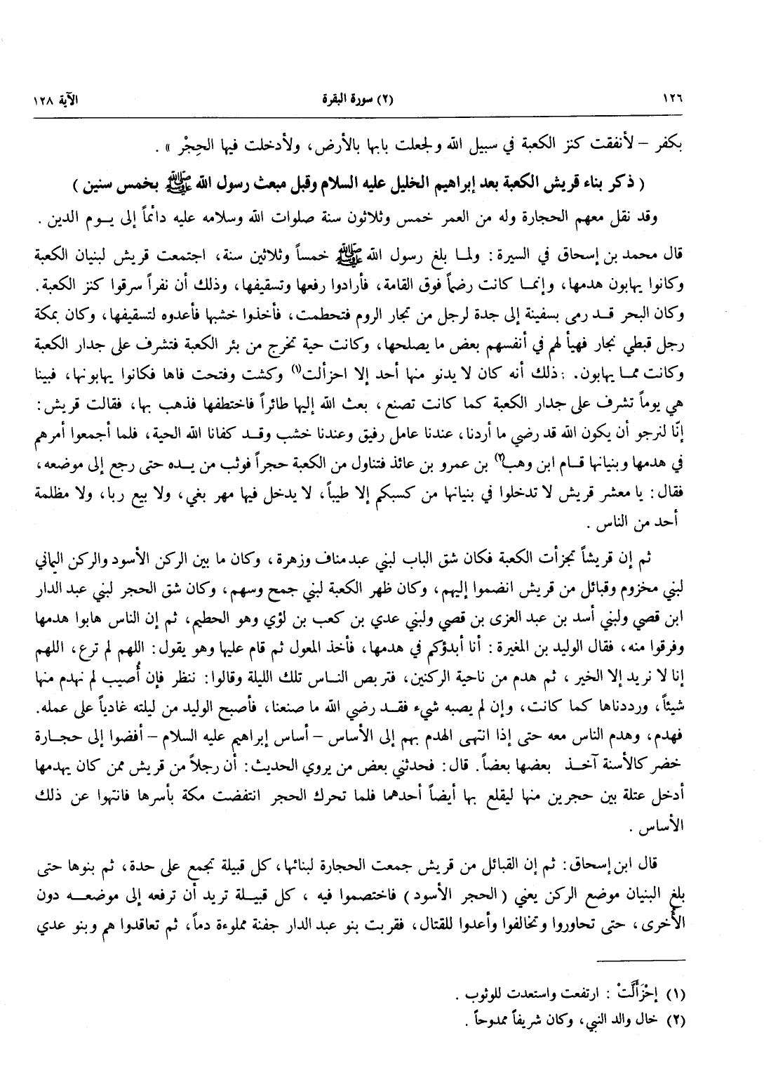 ثُمَّ إِنَّ قُرَيْشًا تَجَزَّأَتِ الْكَعْبَةَ فَكَانَ شِقُّ الْبَابِ لِبَنِي عَبْدِ مَنَافٍ وَزُهْرَةَ، وَكَانَ مَا بَيْنَ الرُّكْنِ الْأَسْوَدِ وَالرُّكْنِ الْيَمَانِيِّ لِبَنِي مَخْزُومٍ وَقَبَائِلَ مِنْ قُرَيْشٍ انْضَمُّوا إِلَيْهِمْ، وَكَانَ ظَهْرُ الْكَعْبَةِ لِبَنِي جُمَحٍ وَسَهْمٍ، وَكَانَ شَقُّ الْحِجْرِ لبني عبد الدار ابن قُصَيٍّ وَلِبَنِي أَسَدِ بْنِ عَبْدِ الْعُزَّى بْنِ قُصَيٍّ وَلِبَنِي عَدِيِّ بْنِ كَعْبِ بْنِ لُؤَيٍّ وَهُوَ الْحَطِيمُ، ثُمَّ إِنِ النَّاسَ هَابُوا هَدْمَهَا وَفَرَقُوا مِنْهُ، فَقَالَ الْوَلِيدُ بْنُ الْمُغِيرَةِ: أَنَا أَبْدَؤُكُمْ فِي هَدْمِهَا، فَأَخَذَ الْمِعْوَلَ ثُمَّ قَامَ عَلَيْهَا وَهُوَ يَقُولُ: اللَّهُمَّ لَمْ تَرُعِ، اللَّهُمَّ إِنَّا لَا نُرِيدُ إِلَّا الْخَيْرَ، ثُمَّ هَدَمَ مِنْ نَاحِيَةِ الرُّكْنَيْنِ، فَتَرَبَّصَ النَّاسُ تِلْكَ اللَّيْلَةَ وَقَالُوا: نَنْظُرُ فَإِنْ أُصيب لَمْ نَهْدِمْ مِنْهَا شَيْئًا وَرَدَدْنَاهَا كَمَا كَانَتْ وَإِنْ لَمْ يَصُبْهُ شَيْءٌ فَقَدْ رَضِيَ اللَّهُ مَا صَنَعْنَا، فَأَصْبَحَ الْوَلِيدُ مِنْ لَيْلَتِهِ غَادِيًا عَلَى عَمَلِهِ. فَهَدَمَ، وهدم الناس معه حتى انتهى الهدم بهم إلا الْأَسَاسِ - أَسَاسِ إِبْرَاهِيمَ عَلَيْهِ السَّلَامُ - أَفْضَوْا إِلَى حِجَارَةٍ خُضْرٍ كَالْأَسِنَّةِ آخِذٌ بَعْضُهَا بعضاَ قَالَ: فَحَدَّثَنِي بَعْضُ مَنْ يَرْوِي الْحَدِيثَ: أَنَّ رَجُلًا مِنْ قُرَيْشٍ مِمَّنْ كَانَ يَهْدِمُهَا أَدْخَلَ عَتَلَةً بين حجرين منها ليقلع بها أيضاً أحدهما فلما تحرك الحجر انتفضت مكة بأسرها فانتهوا عن ذلك الأساس.