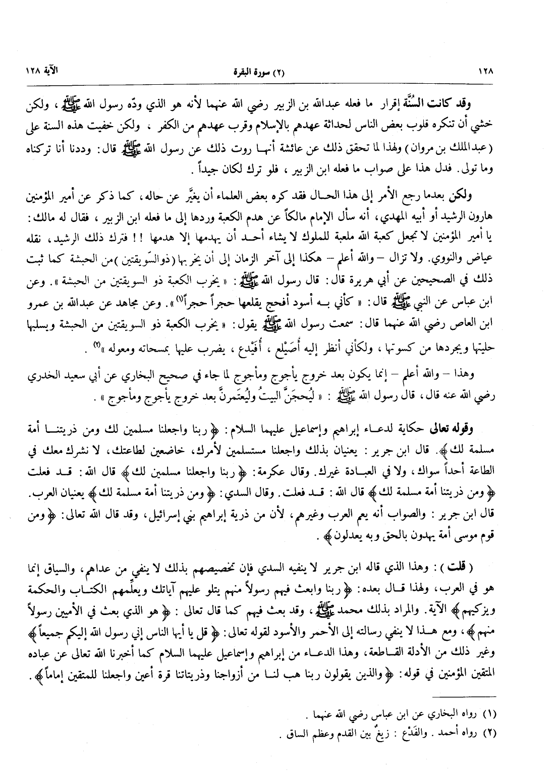 وَقَدْ كَانَتِ السُنَّة إِقْرَارَ مَا فَعَلَهُ عَبْدُ اللَّهِ بْنِ الزُّبَيْرِ رَضِيَ اللَّهُ عَنْهُمَا لِأَنَّهُ هُوَ الذِي وَدَّهُ رَسُولُ اللَّهِ صَلَّى اللَّهُ عَلَيْهِ وَسَلَّمَ، وَلَكِنْ خَشِيَ أَنْ تُنْكِرَهُ قُلُوبُ بَعْضِ النَّاسِ لِحَدَاثَةِ عَهْدِهِمْ بِالْإِسْلَامِ وَقُرْبِ عَهْدِهِمْ مِنَ الْكُفْرِ، وَلَكِنْ خَفِيَتْ هَذِهِ السُّنَّةُ على (عبد الملك بن مروان) وَلِهَذَا لَمَّا تَحَقَّقَ ذَلِكَ عَنْ عَائِشَةَ أَنَّهَا رَوَتْ ذَلِكَ عَنْ رَسُولِ اللَّهِ صَلَّى اللَّهُ عَلَيْهِ وَسَلَّمَ قَالَ: وَدِدْنَا أَنَّا تَرَكْنَاهُ وَمَا تولى. فَدَلَّ هَذَا عَلَى صَوَابِ مَا فَعَلَهُ ابْنُ الزبير، فلو ترك لكان جيداً.