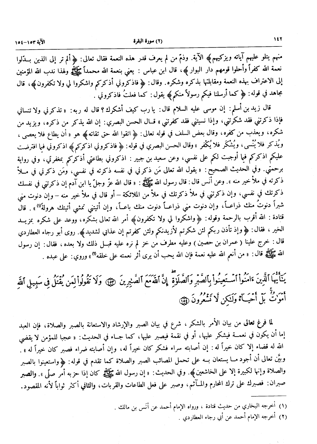 لَمَّا فَرَغَ تَعَالَى مِنْ بيان الأمر بالشكر، شرع في بينان الصبر والإرشاد والاستعانة بِالصَّبْرِ وَالصَّلَاةِ، فَإِنَّ الْعَبْدَ إِمَّا أَنْ يَكُونَ فِي نِعْمَةٍ فَيَشْكُرُ عَلَيْهَا، أَوْ فِي نِقْمَةٍ فَيَصْبِرُ عَلَيْهَا، كَمَا جَاءَ فِي الْحَدِيثِ: "عَجَبًا لِلْمُؤْمِنِ لَا يَقْضِي اللَّهُ لَهُ قَضَاءً إِلَّا كَانَ خَيْرًا لَهُ: إِنْ أَصَابَتْهُ سَرَّاءُ فَشَكَرَ كَانَ خَيْرًا لَهُ، وَإِنْ أَصَابَتْهُ ضَرَّاءُ فَصَبَرَ كَانَ خَيْرًا لَهُ". وبيَّن تَعَالَى أَنَّ أَجْوَدَ مَا يُسْتَعَانُ بِهِ عَلَى تَحَمُّلِ الْمَصَائِبِ الصَّبْرُ وَالصَّلَاةُ كَمَا تَقَدَّمَ فِي قَوْلِهِ: {وَاسْتَعِينُوا بِالصَّبْرِ والصلاة وَإِنَّهَا لَكَبِيرَةٌ إلا على الخاشعين} وَفِي الْحَدِيثِ: «أَنَّ رَسُولَ اللَّهِ صَلَّى اللَّهُ عَلَيْهِ وسلم كان إذا حز به أمر صلّى» والصبر صبران: فصبرك عَلَى تَرْكِ الْمَحَارِمِ وَالْمَآثِمِ، وَصَبْرٌ عَلَى فِعْلِ الطَّاعَاتِ وَالْقُرُبَاتِ، وَالثَّانِي أَكْثَرُ ثَوَابًا لِأَنَّهُ الْمَقْصُودُ، -[143]- وأما الصبر الثالث وهو الصبر على المصائب والنوائب فذاك أيضاً واجب كالاستغفار من المعايب. قال زَيْنُ الْعَابِدِينَ: إِذَا جَمَعَ اللَّهُ الْأَوَّلِينَ وَالْآخِرِينَ يُنَادِي مُنَادٍ أَيْنَ الصَّابِرُونَ لِيَدْخُلُوا الْجَنَّةَ قَبْلَ الحساب؟ قال: فيقوم عُنُق (جماعة متقدمة، وزين العابدين هو (علي بن الحسين) رضي الله عنه) مِنَ النَّاسِ فَتَتَلَقَّاهُمُ الْمَلَائِكَةُ فَيَقُولُونَ: إِلَى أَيْنَ يَا بَنِي آدَمَ؟ فَيَقُولُونَ: إِلَى الْجَنَّةِ، فَيَقُولُونَ: قبل الحساب؟ قالوا: نعم، قالوا: مَن أنتم؟ قالوا: نحن الصابرون، قالوا: وما كان صبكم؟ قَالُوا: صَبَرْنَا عَلَى طَاعَةِ اللَّهِ وَصَبَرْنَا عَنْ معصية الله حتى توفانا الله، قالو: أَنْتُمْ كَمَا قُلْتُمُ ادْخُلُوا الْجَنَّةَ فَنِعْمَ أَجْرُ الْعَامِلِينَ. (قُلْتُ): وَيَشْهَدُ لِهَذَا قَوْلُهُ تَعَالَى: {إِنَّمَا يُوَفَّى الصابرون أَجْرَهُمْ بِغَيْرِ حساب}، وَقَالَ سَعِيدُ بْنُ جُبَيْرٍ: الصَّبْرُ اعْتِرَافُ الْعَبْدِ لِلَّهِ بِمَا أَصَابَ مِنْهُ، وَاحْتِسَابُهُ عِنْدَ اللَّهِ رَجَاءَ ثَوَابِهِ، وَقَدْ يَجْزَعُ الرَّجُلُ وَهُوَ مُتَجَلِّدٌ لَا يُرَى مِنْهُ إِلَّا الصَّبْرُ.
