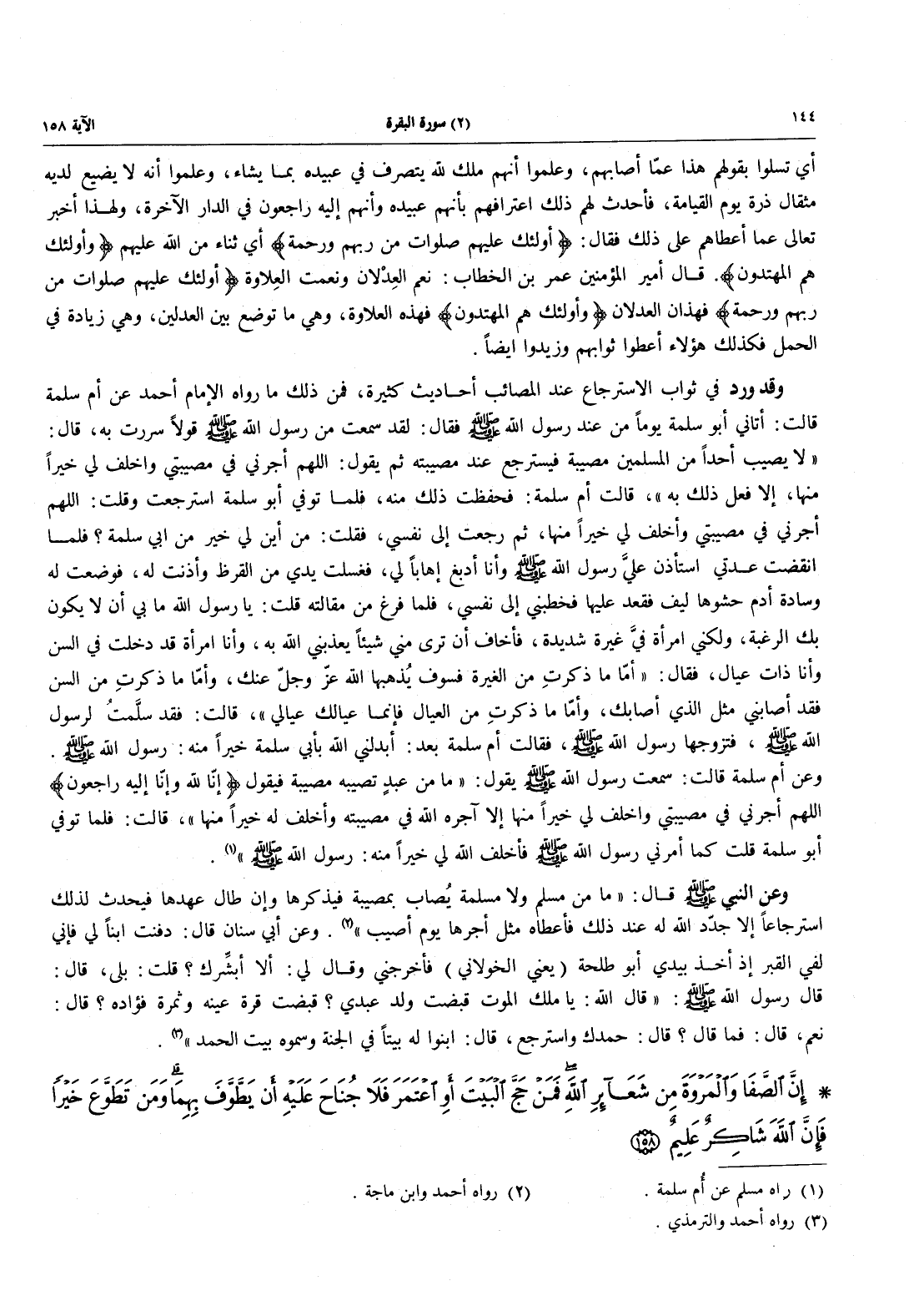 - 158 - إِنَّ الصَّفَا وَالْمَرْوَةَ مِنْ شَعَائِرِ اللَّهِ فَمَنْ حَجَّ الْبَيْتَ أَوِ اعْتَمَرَ فَلاَ جُنَاحَ عَلَيْهِ أَنْ يَطَّوَّفَ بِهِمَا وَمَن تَطَوَّعَ خَيْراً فَإِنَّ الله شَاكِرٌ عليم