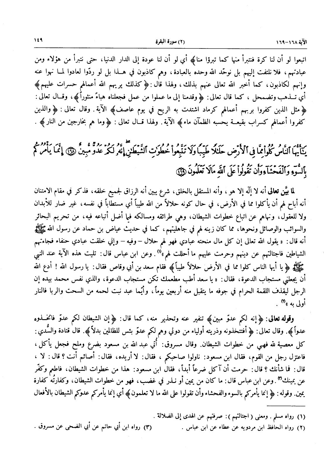 - 168 - يَا أَيُّهَا النَّاسُ كُلُواْ مِمَّا فِي الْأَرْضِ حَلاَلاً طَيِّباً وَلاَ تَتَّبِعُواْ خُطُوَاتِ الشَّيْطَانِ إِنَّهُ لَكُمْ عَدُوٌّ مُبِينٌ