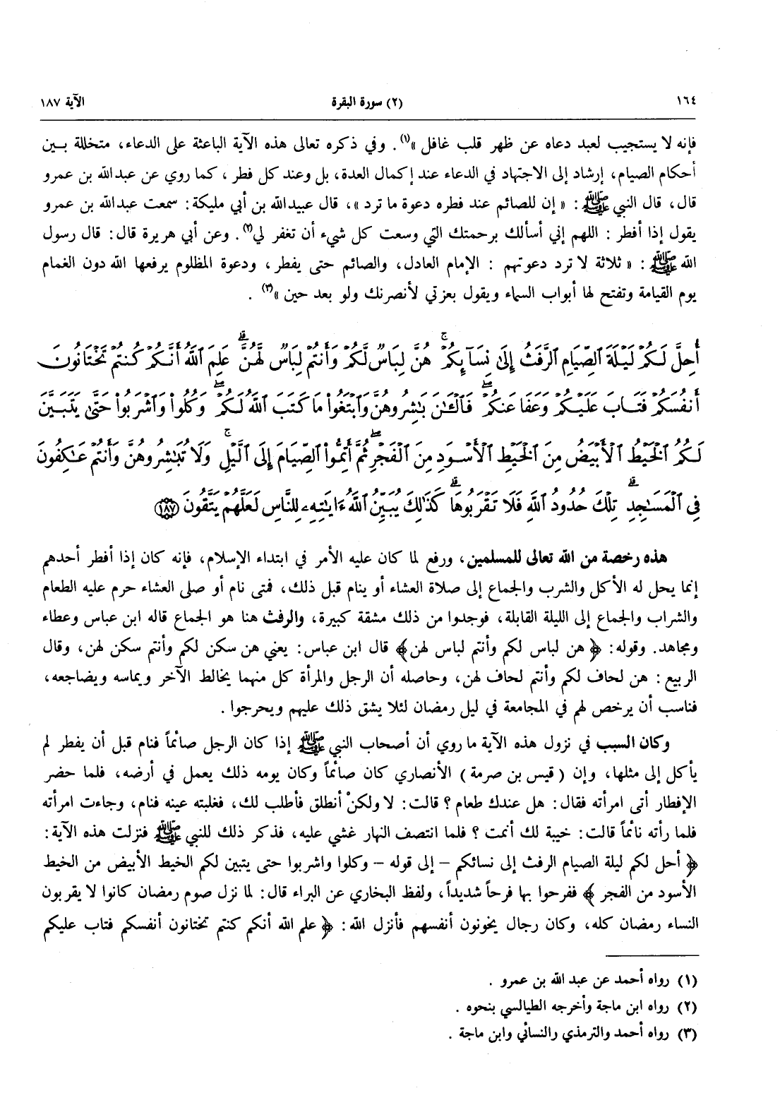- 187 - أُحِلَّ لَكُمْ لَيْلَةَ الصِّيَامِ الرَّفَثُ إِلَى نِسَائِكُمْ هُنَّ لِبَاسٌ لَّكُمْ وَأَنْتُمْ لِبَاسٌ لَّهُنَّ عَلِمَ اللَّهُ أَنَّكُمْ كُنتُمْ تَخْتانُونَ أَنْفُسَكُمْ فَتَابَ عَلَيْكُمْ وَعَفَا عَنْكُمْ فَالْآنَ بَاشِرُوهُنَّ وَابْتَغُوا مَا كَتَبَ اللَّهُ لَكُمْ وَكُلُواْ وَاشْرَبُوا حَتَّى يَتَبَيَّنَ لَكُمُ الْخَيْطُ الْأَبْيَضُ مِنَ الْخَيْطِ الْأَسْوَدِ مِنَ الْفَجْرِ ثُمَّ أَتِمُّواْ الصِّيَامَ إِلَى اللَّيْلِ وَلاَ تُبَاشِرُوهُنَّ وَأَنْتُمْ عَاكِفُونَ فِي الْمَسَاجِدِ تِلْكَ حُدُودُ اللَّهِ فَلَا تَقْرَبُوهَا كَذَلِكَ يُبَيِّنُ اللَّهُ آيَاتِهِ لِلنَّاسِ لَعَلَّهُمْ يَتَّقُونَ