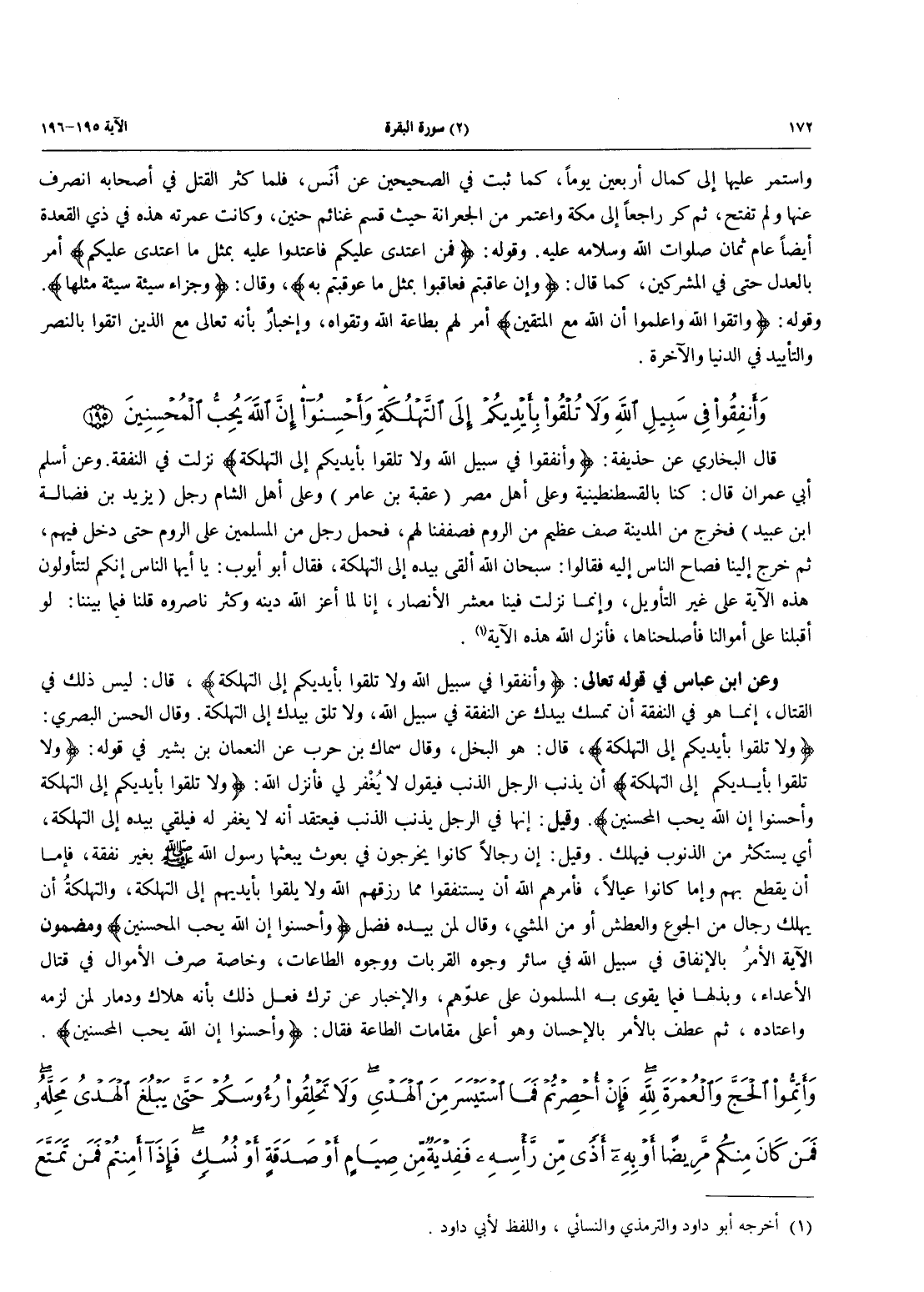 قال البخاري عَنْ حُذَيْفَةَ: {وَأَنْفِقُواْ فِي سَبِيلِ اللَّهِ وَلَا تُلْقُواْ بِأَيْدِيكُمْ إِلَى التهلكة} نزلت في النفقة. وعن أسلم أبي عمران قال: كُنَّا بِالْقُسْطَنْطِينِيَّةِ وَعَلَى أَهْلِ مِصْرَ (عُقْبَةُ بْنُ عامر) وعلى أهل الشام رجل (يزيد بن فضالة ابن عُبَيْدٍ) فَخَرَجَ مِنَ الْمَدِينَةِ صَفٌّ عَظِيمٌ مِنَ الرُّومِ فَصَفَفْنَا لَهُمْ، فَحَمَلَ رَجُلٌ مِنَ الْمُسْلِمِينَ عَلَى الرُّومِ حَتَّى دَخَلَ فِيهِمْ، ثُمَّ خَرَجَ إِلَيْنَا فَصَاحَ النَّاسُ إِلَيْهِ فَقَالُوا: سُبْحَانَ اللَّهِ أَلْقَى بِيَدِهِ إِلَى التَّهْلُكَةِ، فَقَالَ أَبُو أَيُّوبَ: يَا أَيُّهَا النَّاسُ إِنَّكُمْ لَتَتَأَوَّلُونَ هَذِهِ الْآيَةَ عَلَى غَيْرِ التَّأْوِيلِ، وَإِنَّمَا نَزَلَتْ فِينَا مَعْشَرَ الأنصار، إنا لَمَّا أَعَزَّ اللَّهُ دِينَهُ وَكَثُرَ نَاصِرُوهُ قُلْنَا فِيمَا بَيْنَنَا: لَوْ أَقْبَلْنَا عَلَى أَمْوَالِنَا فَأَصْلَحْنَاهَا، فأنزل الله هذه الآية (أخرجه أبو داود والترمذي والنسائي، واللفظ لأبي داود)