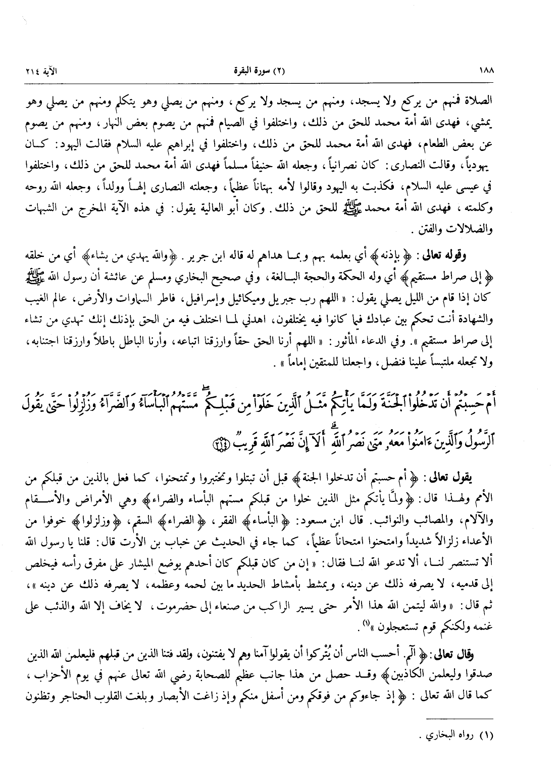 - 214 - أَمْ حَسِبْتُمْ أَن تَدْخُلُواْ الْجَنَّةَ وَلَمَّا يَأْتِكُم مَّثَلُ الَّذِينَ خَلَوْاْ مِن قَبْلِكُم مَّسَّتْهُمُ الْبَأْسَاءُ وَالضَّرَّاءُ وَزُلْزِلُواْ حَتَّى يَقُولَ الرَّسُولُ وَالَّذِينَ آمَنُواْ مَعَهُ مَتَى نَصْرُ اللَّهِ أَلَا إِنَّ نَصْرَ اللَّهِ قَرِيبٌ