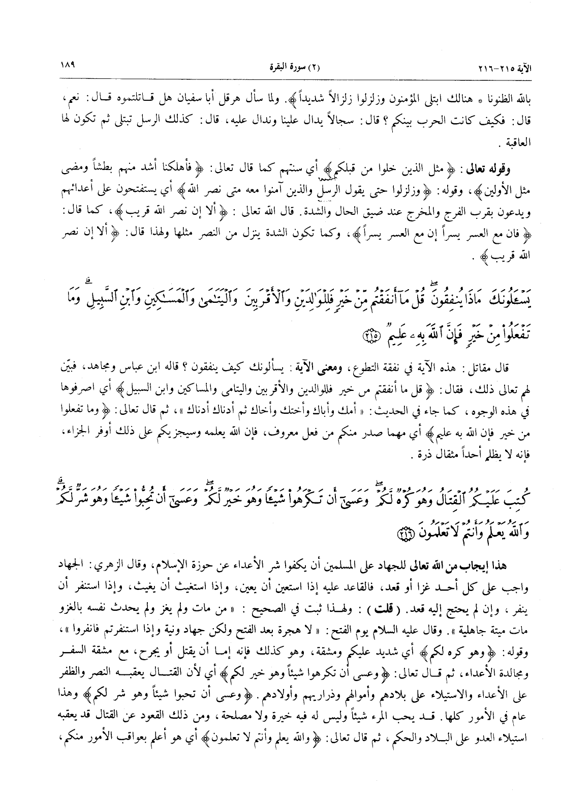 هَذَا إِيجَابٌ مِنَ اللَّهِ تَعَالَى لِلْجِهَادِ عَلَى الْمُسْلِمِينَ أَنْ يَكُفُّوا شَرَّ الْأَعْدَاءِ عَنْ حَوْزَةِ الْإِسْلَامِ، وَقَالَ الزُّهْرِيُّ: الْجِهَادُ وَاجِبٌ عَلَى كُلِّ أَحَدٍ غَزَا أَوْ قَعَدَ، فَالْقَاعِدُ عَلَيْهِ إِذَا اسْتُعِينَ أَنْ يُعِينَ، وَإِذَا اسْتُغِيثَ أَنْ يُغِيثَ، وَإِذَا اسْتُنْفِرَ أَنْ يَنْفِرَ، وَإِنْ لَمْ يُحْتَجْ إِلَيْهِ قَعَدَ. (قُلْتُ) وَلِهَذَا ثَبَتَ فِي الصَّحِيحِ: «مَنْ مَاتَ وَلَمْ يغز ولم يحدث نفسه بالغزو مَاتَ مِيتَةً جَاهِلِيَّةً». وَقَالَ عَلَيْهِ السَّلَامُ يَوْمَ الفتح: «لَا هِجْرَةَ بَعْدَ الْفَتْحِ وَلَكِنْ جِهَادٌ وَنِيَّةٌ وإذا اسْتُنْفِرْتُمْ فَانْفِرُوا»، وَقَوْلُهُ: {وَهُوَ كُرْهٌ لَّكُمْ} أَيْ شَدِيدٌ عَلَيْكُمْ وَمَشَقَّةٌ، وَهُوَ كَذَلِكَ فَإِنَّهُ إِمَّا أَنْ يُقْتَلَ أَوْ يُجْرَحَ، مَعَ مَشَقَّةِ السَّفَرِ وَمُجَالَدَةِ الْأَعْدَاءِ، ثُمَّ قَالَ تَعَالَى: {وَعَسَى أَن تَكْرَهُواْ شَيْئاً وَهُوَ خَيْرٌ لَّكُمْ} أَيْ لِأَنَّ الْقِتَالَ يَعْقُبُهُ النَّصْرُ وَالظَّفَرُ عَلَى الْأَعْدَاءِ وَالِاسْتِيلَاءُ عَلَى بِلَادِهِمْ وَأَمْوَالِهِمْ وَذَرَارِيِّهِمْ وَأَوْلَادِهِمْ {وَعَسَى أَن تُحِبُّواْ شَيْئاً وَهُوَ شَرٌّ لَّكُمْ} وَهَذَا عَامٌّ فِي الْأُمُورِ كُلِّهَا. قَدْ يُحِبُّ الْمَرْءُ شَيْئًا وَلَيْسَ لَهُ فِيهِ خِيَرَةٌ وَلَا مَصْلَحَةٌ، وَمِنْ ذَلِكَ الْقُعُودُ عَنِ الْقِتَالِ قَدْ يَعْقُبُهُ اسْتِيلَاءُ العدوا عَلَى الْبِلَادِ وَالْحُكْمِ، ثُمَّ قَالَ تَعَالَى: {وَاللَّهُ يَعْلَمُ وَأَنْتُمْ لاَ تَعْلَمُونَ} أَيْ هُوَ أَعْلَمُ بِعَوَاقِبِ الْأُمُورِ مِنْكُمْ، -[190]- وَأَخْبَرُ بِمَا فِيهِ صَلَاحُكُمْ فِي دُنْيَاكُمْ وأُخراكم، فَاسْتَجِيبُوا لَهُ وَانْقَادُوا لِأَمْرِهِ لعلكم ترشدون.