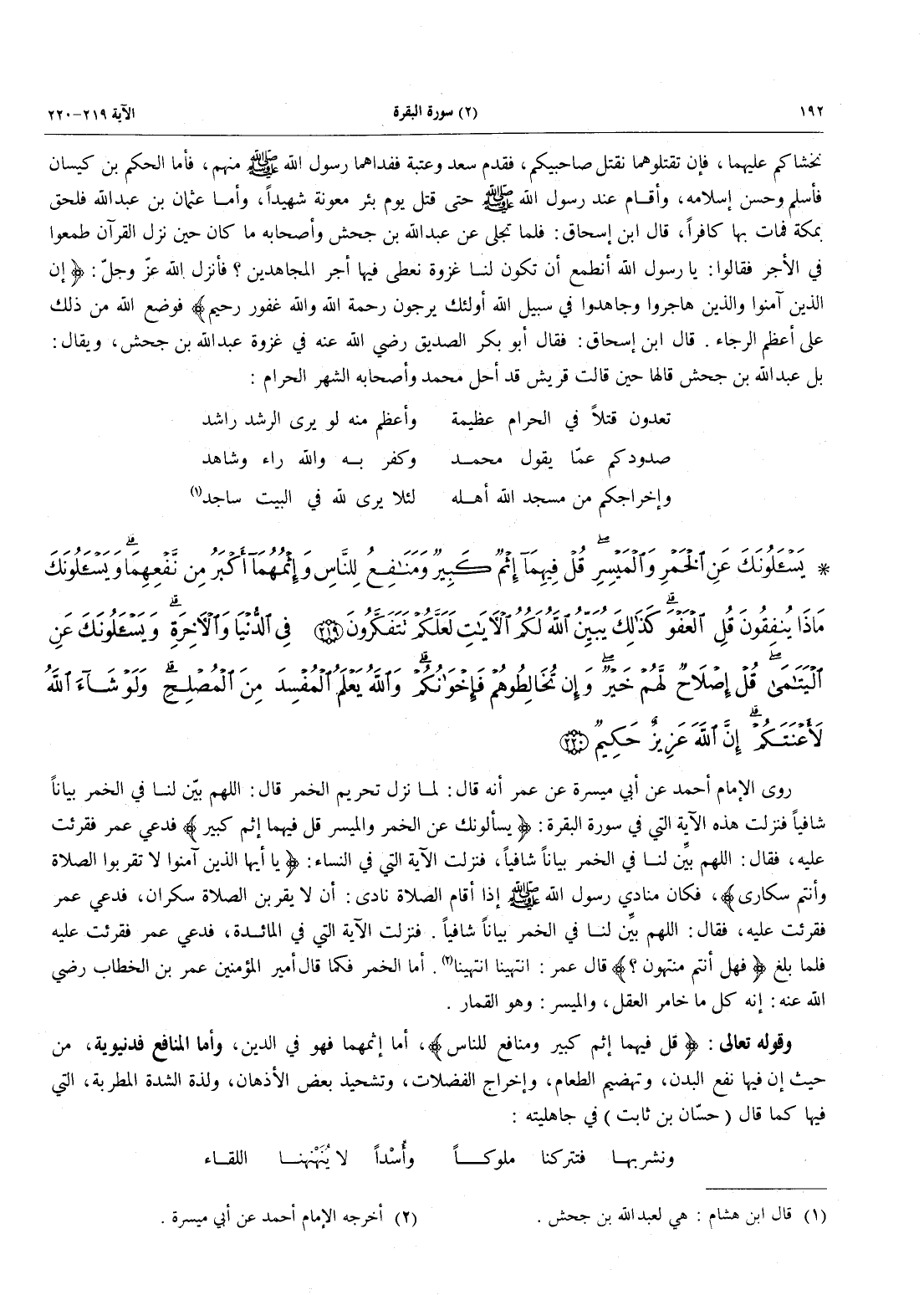 روى الإمام أحمد عَنْ أَبِي مَيْسَرَةَ عَنْ عُمَرَ أَنَّهُ قَالَ: لَمَّا نَزَلَ تَحْرِيمُ الْخَمْرِ قَالَ: اللَّهُمَّ بَيِّنْ لَنَا فِي الْخَمْرِ بَيَانًا شَافِيًا فَنَزَلَتْ هَذِهِ الآية التي في سورة الْبَقَرَةِ: {يَسْأَلُونَكَ عَنِ الْخَمْرِ وَالْمَيْسِرِ قُلْ فِيهِمَآ إِثْمٌ كَبِيرٌ} فَدُعِيَ عُمَرُ فَقُرِئَتْ عَلَيْهِ، فَقَالَ: اللَّهُمَّ بيِّن لَنَا فِي الْخَمْرِ بَيَانًا شَافِيًا، فَنَزَلَتِ الْآيَةُ التِي فِي النِّسَاءِ: {يَا أَيُّهَا الَّذِينَ آمَنُوا لَا تَقْرَبُوا الصَّلَاةَ وَأَنْتُمْ سُكَارَى} فَكَانَ مُنَادِي رَسُولِ اللَّهِ صَلَّى اللَّهُ عَلَيْهِ وَسَلَّمَ إِذَا قام الصلاة نادى: أن لا يَقْرَبَنَّ الصَّلَاةَ سَكْرَانُ، فَدُعِيَ عُمَرُ فَقُرِئَتْ عَلَيْهِ، فَقَالَ: اللَّهُمَّ بيِّن لَنَا فِي الْخَمْرِ بَيَانًا شَافِيًا. فَنَزَلَتِ الْآيَةُ التِي فِي الْمَائِدَةِ، فَدَعِي عُمَرُ فَقُرِئَتْ عَلَيْهِ فَلَمَّا بَلَغَ {فَهَلْ أَنْتُمْ مُّنتَهُونَ؟} قال عمر: انتهينا انتهينا (أخرجه الإمام أحمد عن أبي ميسرة) أَمَّا الْخَمْرُ فَكَمَا قَالَ أَمِيرُ الْمُؤْمِنِينَ عُمَرُ بْنِ الْخَطَّابِ رَضِيَ اللَّهُ عنه: أنه كل ما خامر العقل، والميسر: وهو القمار.