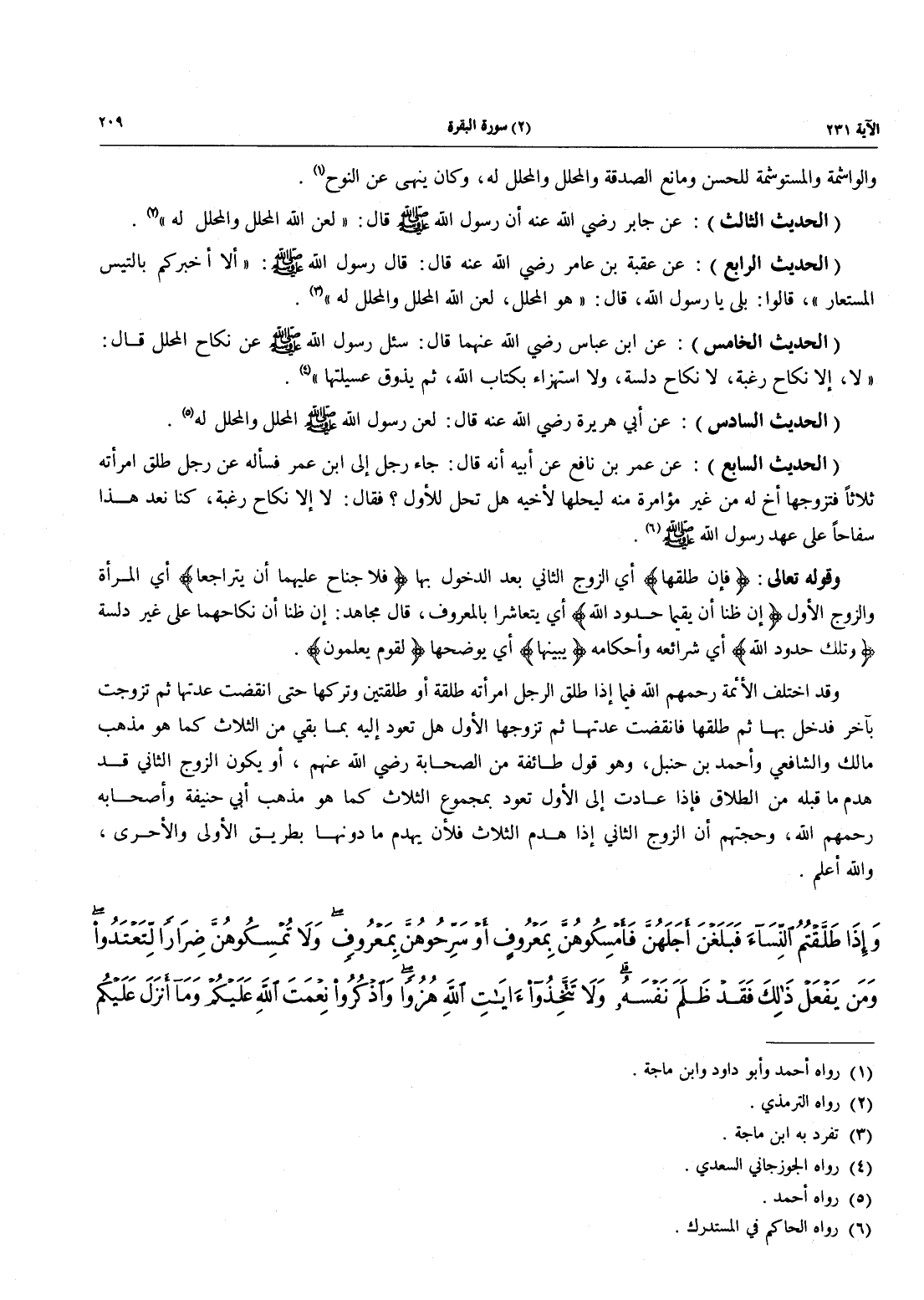- 231 - وَإِذَا طَلَّقْتُمُ النِّسَاءَ فَبَلَغْنَ أَجَلَهُنَّ فَأَمْسِكُوهُنَّ بِمَعْرُوفٍ أَوْ سَرِّحُوهُنَّ بِمَعْرُوفٍ وَلاَ تُمْسِكُوهُنَّ ضِرَاراً لِتَعْتَدُوا وَمَن يَفْعَلْ ذَلِكَ فَقَدْ ظَلَمَ نَفْسَهُ وَلاَ تَتَّخِذُوا آيَاتِ اللَّهِ هُزُواً وَاذْكُرُوا نِعْمَةَ اللَّهِ عَلَيْكُمْ وَمَآ أَنزَلَ عَلَيْكُمْ -[210]- مِّنَ الْكِتَابِ وَالْحِكْمَةِ يَعِظُكُمْ بِهِ وَاتَّقُوا اللَّهَ وَاعْلَمُوا أَنَّ اللَّهَ بِكُلِّ شَيْءٍ عَلِيمٌ