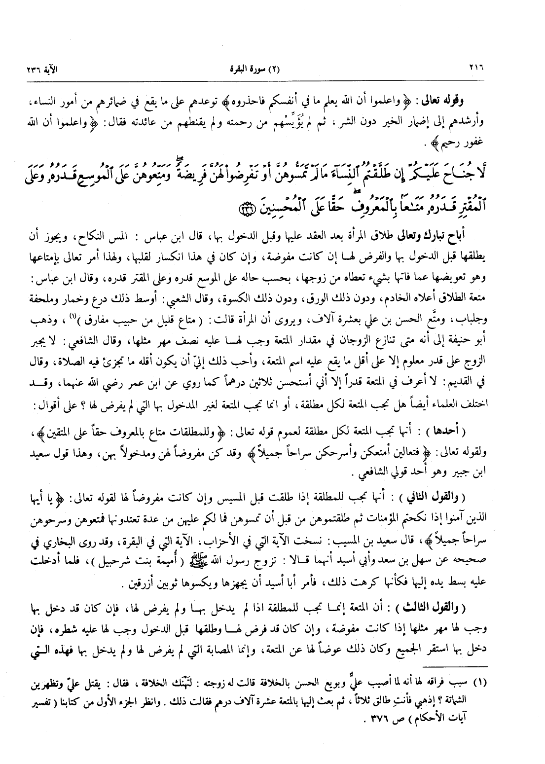 (أحدها): أنها تَجِبُ الْمُتْعَةُ لِكُلِّ مُطَلَّقَةٍ لِعُمُومِ قَوْلِهِ تَعَالَى: {وَلِلْمُطَلَّقَاتِ مَتَاعٌ بالمعروف حَقّاً عَلَى المتقين} ولقوله تعالى: {فَتَعَالَيْنَ أُمَتِّعْكُنَّ وَأُسَرِّحْكُنَّ سَرَاحاً جَمِيلاً} وَقَدْ كُنَّ مَفْرُوضًا لَهُنَّ وَمَدْخُولًا بِهِنَّ، وَهَذَا قول سعيد ابن جبير وهو أحد قولي الشافعي.