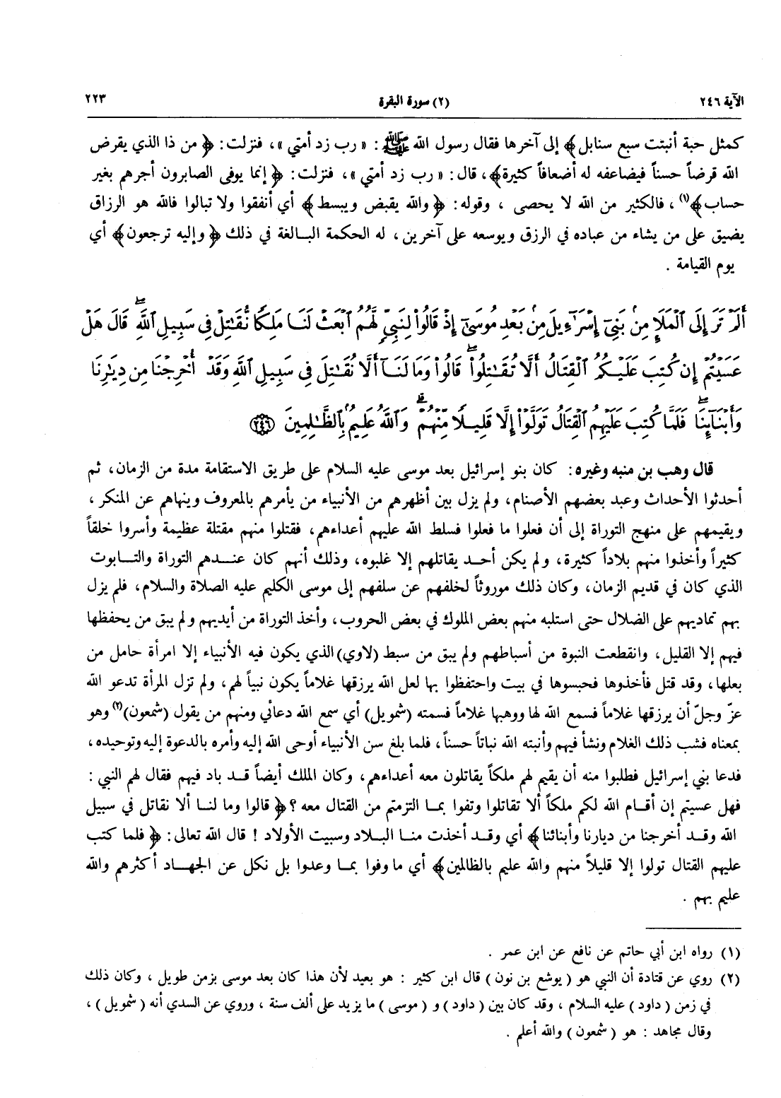 - 246 - أَلَمْ تَرَ إِلَى الْمَلَأِ مِن بَنِي إِسْرَائِيلَ مِن بَعْدِ مُوسَى إِذْ قَالُوا لِنَبِيٍّ لَهُمُ ابْعَثْ لَنَا مَلِكًا نُقَاتِلَ فِي سَبِيلِ اللَّهِ قَالَ هَلْ عَسَيْتُمْ إِنْ كُتِبَ عَلَيْكُمُ الْقِتَالُ أَلَّا تُقَاتِلُوا قَالُواْ وَمَا لَنَآ أَلاَّ نُقَاتِلَ فِي سَبِيلِ اللَّهِ وَقَدْ أُخْرِجْنَا مِن دِيَارِنَا وَأَبْنَائِنَا فَلَمَّا كُتِبَ عَلَيْهِمُ الْقِتَالُ تَوَلَّوْاْ إِلاَّ قَلِيلاً مِّنْهُمْ والله عَلِيمٌ بالظالمين