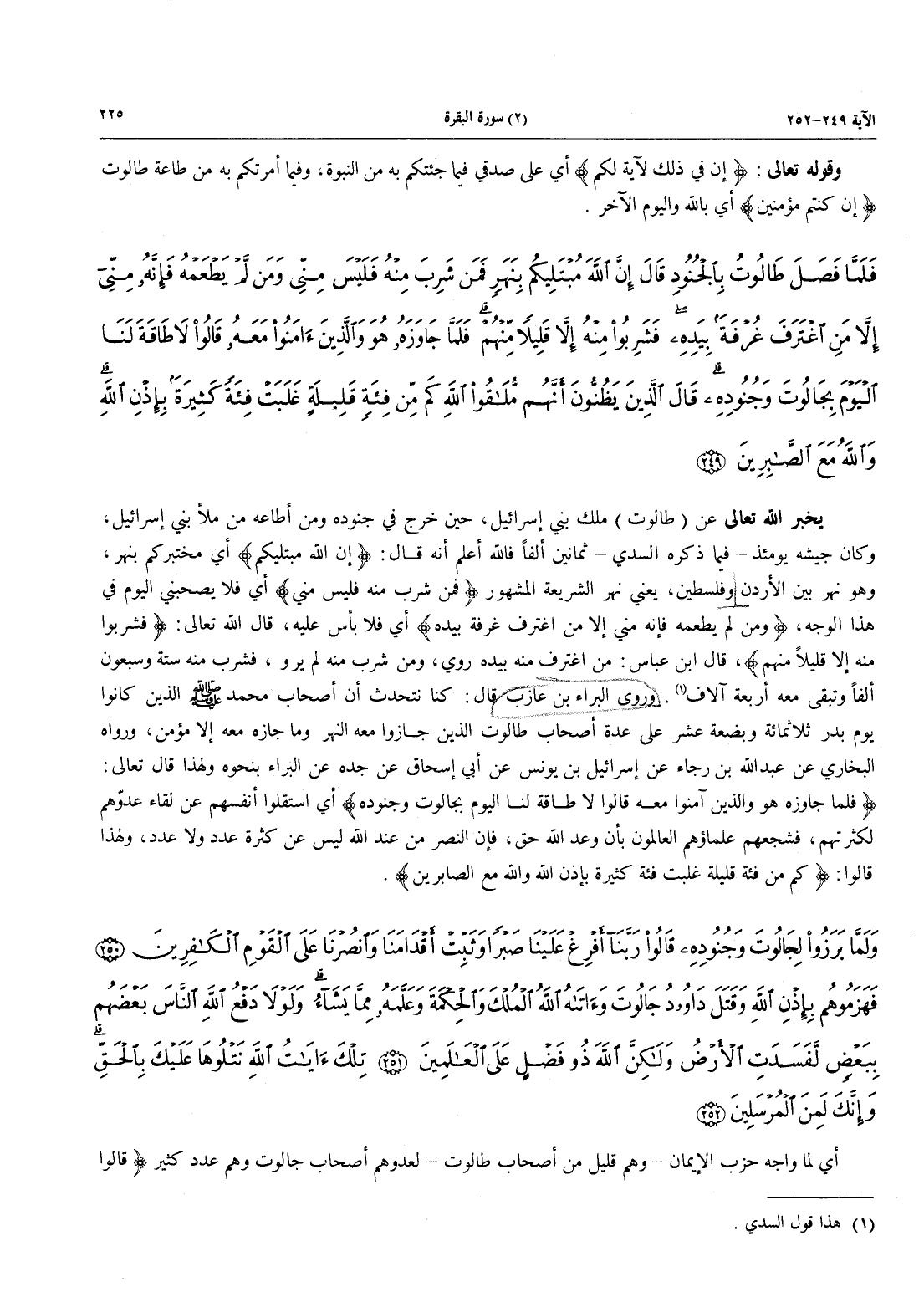 يخبر الله تعالى عَنْ (طَالُوتَ) مَلِكِ بَنِي إِسْرَائِيلَ، حِينَ خَرَجَ فِي جُنُودِهِ وَمَنْ أَطَاعَهُ مِنْ مَلَأِ بَنِي إِسْرَائِيلَ، وَكَانَ جَيْشُهُ يَوْمَئِذٍ - فِيمَا ذَكَرَهُ السُّدِّيُّ - ثَمَانِينَ أَلْفًا فَاللَّهُ أَعْلَمُ أَنَّهُ قَالَ: {إِنَّ الله مُبْتَلِيكُمْ} أي مختبركم بنهر، وَهُوَ نَهْرٌ بَيْنَ الْأُرْدُنِّ وَفِلَسْطِينَ، يَعْنِي نَهْرُ الشَّرِيعَةِ الْمَشْهُورُ {فَمَن شَرِبَ مِنْهُ فَلَيْسَ مِنِّي} أَيْ فَلَا يَصْحَبُنِي الْيَوْمَ فِي هَذَا الْوَجْهِ، {وَمَن لَّمْ يَطْعَمْهُ فَإِنَّهُ مِنِّي إِلاَّ مَنِ اغْتَرَفَ غُرْفَةً بِيَدِهِ} أَيْ فَلَا بَأْسَ عَلَيْهِ، قَالَ اللَّهُ تَعَالَى: {فَشَرِبُواْ مِنْهُ إِلاَّ قَلِيلاً مِّنْهُمْ}، قَالَ ابْنُ عَبَّاسٍ: مَنِ اغْتَرَفَ مِنْهُ بِيَدِهِ روي، ومن شرب منه لم يرو، فشرب منه سِتَّةٌ وَسَبْعُونَ أَلْفًا وَتَبَقَّى مَعَهُ أَرْبَعَةُ آلَافٍ (هذا قول السدي) وروى الْبَرَاءِ بْنِ عَازِبٍ قَالَ: كُنَّا نَتَحَدَّثُ أَنَّ أَصْحَابَ مُحَمَّدٍ صَلَّى اللَّهُ عَلَيْهِ وَسَلَّمَ الَّذِينَ كَانُوا يَوْمَ بَدْرٍ ثَلَاثَمِائَةٍ وَبِضْعَةَ عَشَرَ عَلَى عِدَّةِ أَصْحَابِ طَالُوتَ الَّذِينَ جَازُوا مَعَهُ النَّهْرَ وَمَا جَازَهُ مَعَهُ إِلَّا مُؤْمِنٌ، وَرَوَاهُ الْبُخَارِيُّ عَنْ عَبْدِ اللَّهِ بْنِ رَجَاءٍ عَنْ إِسْرَائِيلَ بن يونس عن أبي إسحاق عن جده عَنِ الْبَرَاءِ بِنَحْوِهِ وَلِهَذَا قَالَ تَعَالَى: {فَلَمَّا جَاوَزَهُ هُوَ الذين آمَنُواْ مَعَهُ قَالُواْ لاَ طَاقَةَ لَنَا الْيَوْمَ بِجَالُوتَ وَجُنودِهِ} أَيِ اسْتَقَلُّوا أَنْفُسَهُمْ عَنْ لِقَاءِ عدوّهم لكثرتهم، فشجعهم علماؤهم العالمون بأن عد اللَّهِ حَقٌّ، فَإِنَّ النَّصْرَ مِنْ عِنْدِ اللَّهِ لَيْسَ عَنْ كَثْرَةِ عَدَدٍ وَلَا عِدَدٍ، وَلِهَذَا قَالُوا: {كَم مِّن فِئَةٍ قَلِيلَةٍ غَلَبَتْ فِئَةً كَثِيرَةً بِإِذْنِ اللَّهِ وَاللَّهُ مَعَ الصَّابِرِينَ}.