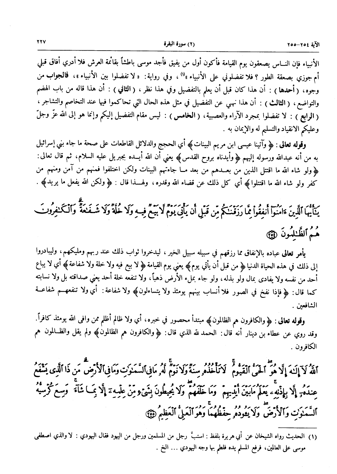 - 255 - اللَّهُ لَا إِلَهَ إِلاَّ هُوَ الْحَيُّ الْقَيُّومُ لاَ تَأْخُذُهُ سِنَةٌ وَلَا نَوْمٌ لَّهُ مَا فِي السَّمَاوَاتِ وَمَا فِي الْأَرْضِ مَنْ ذَا الَّذِي يَشْفَعُ عِنْدَهُ إِلاَّ بِإِذْنِهِ يَعْلَمُ مَا بَيْنَ أَيْدِيهِمْ وَمَا خَلْفَهُمْ وَلاَ يُحِيطُونَ بِشَيْءٍ مِّنْ عِلْمِهِ إِلاَّ بِمَا شَاءَ وَسِعَ كُرْسِيُّهُ السماوات والأرض وَلاَ يَؤُودُهُ حِفْظُهُمَا وَهُوَ الْعَلِيُّ الْعَظِيمُ -[228]-