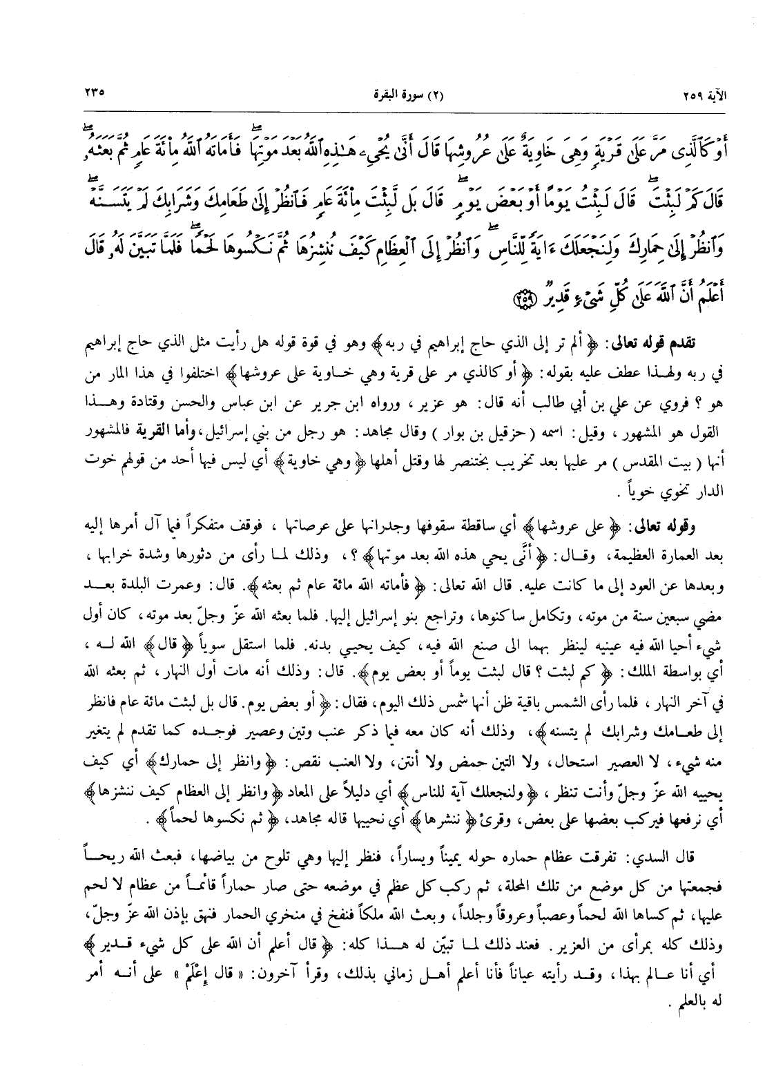 - 259 - أَوْ كَالَّذِي مَرَّ عَلَى قَرْيَةٍ وَهِيَ خَاوِيَةٌ عَلَى عُرُوشِهَا قَالَ أَنَّى يُحْيِي هَذِهِ اللَّهُ بَعْدَ مَوْتِهَا فَأَمَاتَهُ اللَّهُ مِائَةَ عَامٍ ثُمَّ بَعَثَهُ قَالَ كَمْ لَبِثْتَ قَالَ لَبِثْتُ يَوْماً أَوْ بَعْضَ يَوْمٍ قَالَ بَلْ لَبِثْتَ مِائَةَ عَامٍ فَانْظُرْ إِلَى طَعَامِكَ وَشَرَابِكَ لَمْ يَتَسَنَّهْ وَانْظُرْ إِلَى حِمَارِكَ وَلِنَجْعَلَكَ آيَةً لِلنَّاسِ وَانْظُرْ إِلَى الْعِظَامِ كَيْفَ نُنْشِزُهَا ثُمَّ نَكْسُوهَا لَحْماً فَلَمَّا تَبَيَّنَ لَهُ قَالَ أَعْلَمُ أَنَّ اللَّهَ عَلَى كُلِّ شَيْءٍ قَدِيرٌ