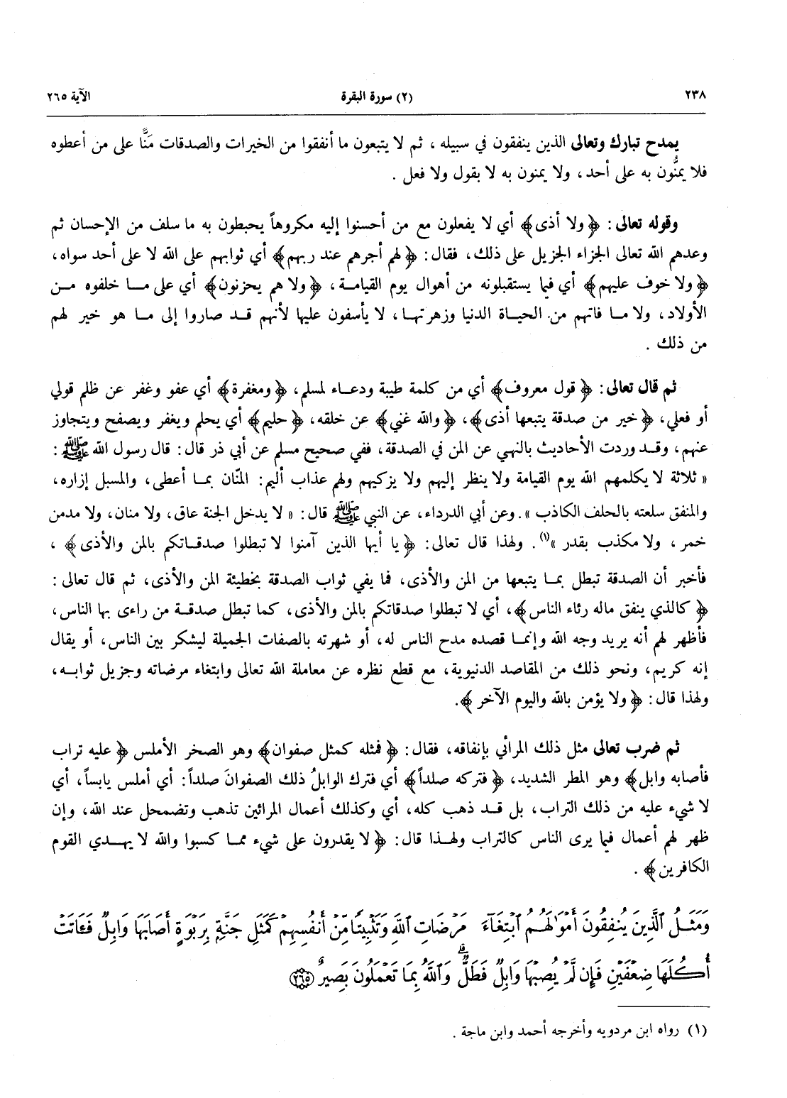 - 265 - ومثل الذين يُنْفِقُونَ أَمْوَالَهُمْ ابتغآء مرضات اللَّهِ وَتَثْبِيتاً مِّنْ أَنْفُسِهِمْ كَمَثَلِ جَنَّةٍ بِرَبْوَةٍ أَصَابَهَا وَابِلٌ فَآتَتْ أُكُلَهَا ضِعْفَيْنِ فَإِن لَّمْ يُصِبْهَا وَابِلٌ فَطَلٌّ وَاللَّهُ بِمَا تَعْمَلُونَ بَصِيرٌ
