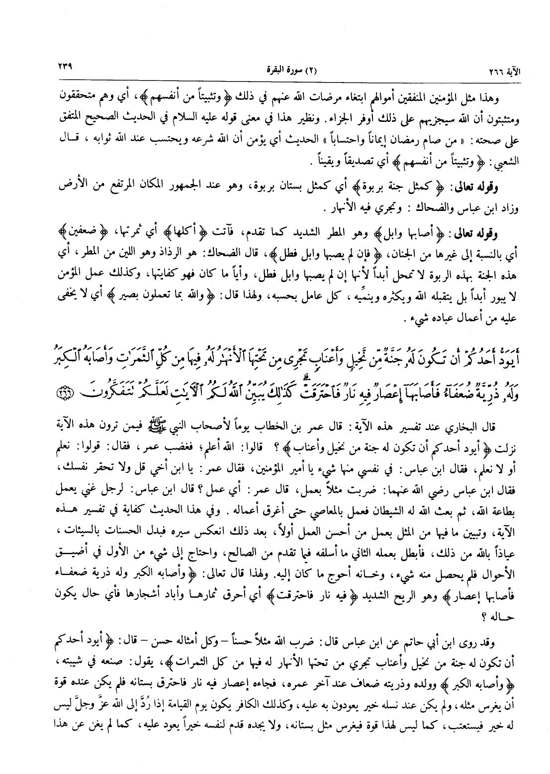 - 266 - أَيَوَدُّ أَحَدُكُمْ أَن تَكُونَ لَهُ جَنَّةٌ مِّن نَّخِيلٍ وَأَعْنَابٍ تَجْرِي مِنْ تَحْتِهَا الْأَنْهَارُ لَهُ فِيهَا مِن كُلِّ الثَّمَرَاتِ وَأَصَابَهُ الْكِبَرُ وَلَهُ ذُرِّيَّةٌ ضُعَفَآءُ فَأَصَابَهَآ إِعْصَارٌ فِيهِ نَارٌ فَاحْتَرَقْتُ كَذَلِكَ يُبَيِّنُ اللَّهُ لَكُمُ الْآيَاتِ لَعَلَّكُمْ تَتَفَكَّرُونَ