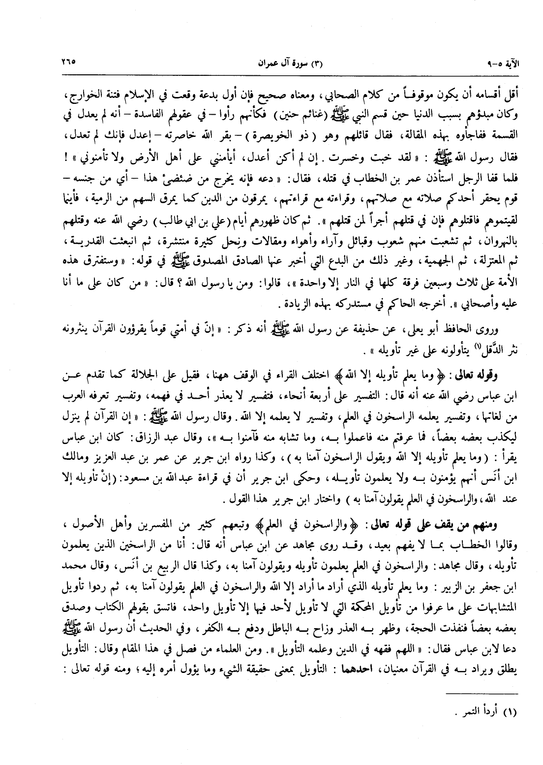 وَمِنْهُمْ مَنْ يقف على قوله تعالى: {وَالرَّاسِخُونَ فِي الْعِلْمِ} وَتَبِعَهُمْ كَثِيرٌ مِنَ الْمُفَسِّرِينَ وَأَهْلِ الْأُصُولِ، وَقَالُوا الْخِطَابُ بِمَا لَا يُفْهَمُ بعيد، وقد روى مُجَاهِدٍ عَنِ ابْنِ عَبَّاسٍ أَنَّهُ قَالَ: أَنَا من الراسخين الذي يعلمون تأويله، وقال مُجَاهِدٍ: وَالرَّاسِخُونَ فِي الْعِلْمِ يَعْلَمُونَ تَأْوِيلَهُ وَيَقُولُونَ آمَنَّا بِهِ، وَكَذَا قَالَ الرَّبِيعُ بْنُ أنَس، وقال مُحَمَّدِ بْنِ جَعْفَرِ بْنِ الزُّبَيْرِ: وَمَا يَعْلَمُ تَأْوِيلَهُ الَّذِي أَرَادَ مَا أَرَادَ إِلَّا اللَّهُ وَالرَّاسِخُونَ فِي الْعِلْمِ يَقُولُونَ آمَنَّا بِهِ، ثُمَّ ردوا تأويل المتشابهات عَلَى مَا عَرَفُوا مِنْ تَأْوِيلِ الْمُحْكَمَةِ الَّتِي لَا تَأْوِيلَ لِأَحَدٍ فِيهَا إِلَّا تَأْوِيلٌ وَاحِدٌ، فَاتَّسَقَ بِقَوْلِهِمُ الْكِتَابُ وَصَدَّقَ بَعْضُهُ بَعْضًا فَنَفَذَتِ الْحُجَّةُ، وَظَهَرَ بِهِ الْعُذْرُ وَزَاحَ بِهِ الْبَاطِلُ وَدُفِعَ بِهِ الْكُفْرُ، وَفِي الْحَدِيثِ أَنَّ رَسُولَ اللَّهِ صَلَّى اللَّهُ عَلَيْهِ وَسَلَّمَ دَعَا لِابْنِ عَبَّاسٍ فَقَالَ: «اللَّهُمَّ فَقِّهْهُ فِي الدِّينِ وَعَلِّمْهُ التَّأْوِيلَ». وَمِنَ الْعُلَمَاءِ مَنْ فَصَّلَ فِي هَذَا المقام وقال: التأويل يطلق ويراد به في لقرآن مَعْنَيَانِ، أَحَدُهُمَا: التَّأْوِيلُ بِمَعْنَى حَقِيقَةِ الشَّيْءِ وَمَا يؤول أمره إليه؛ ومنه قوله تعالى: